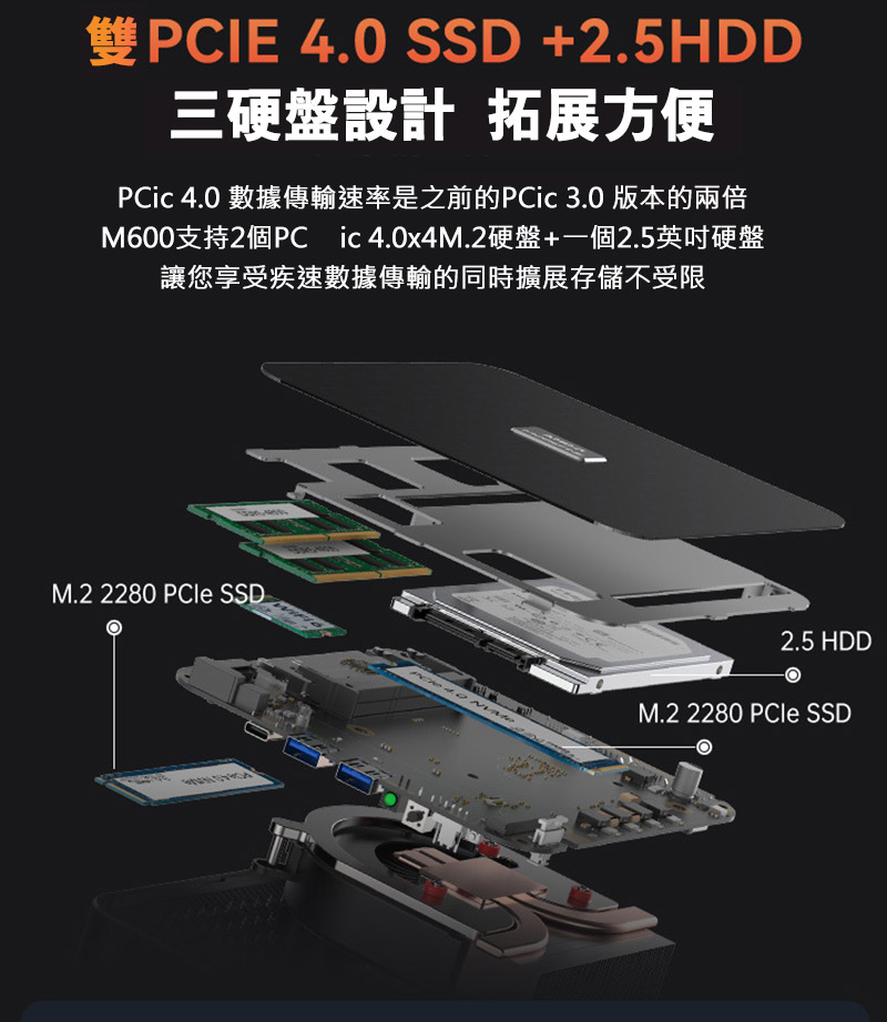 .三硬碟設計,最多可插 M.2 SSD*2 + 2.5 吋硬碟*1