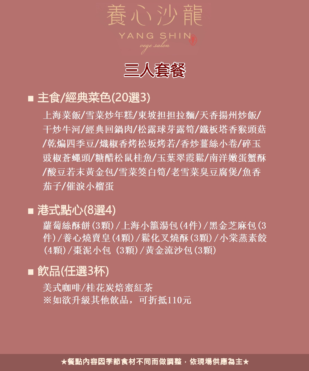 【新店】養心沙龍3人平日午/晚餐或假日午茶套餐