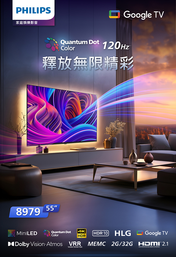 Philips 飛利浦 特價A品 55吋4K 120Hz QD Mini LED Google TV 智慧顯示器 55PML8979 (送基本安裝)