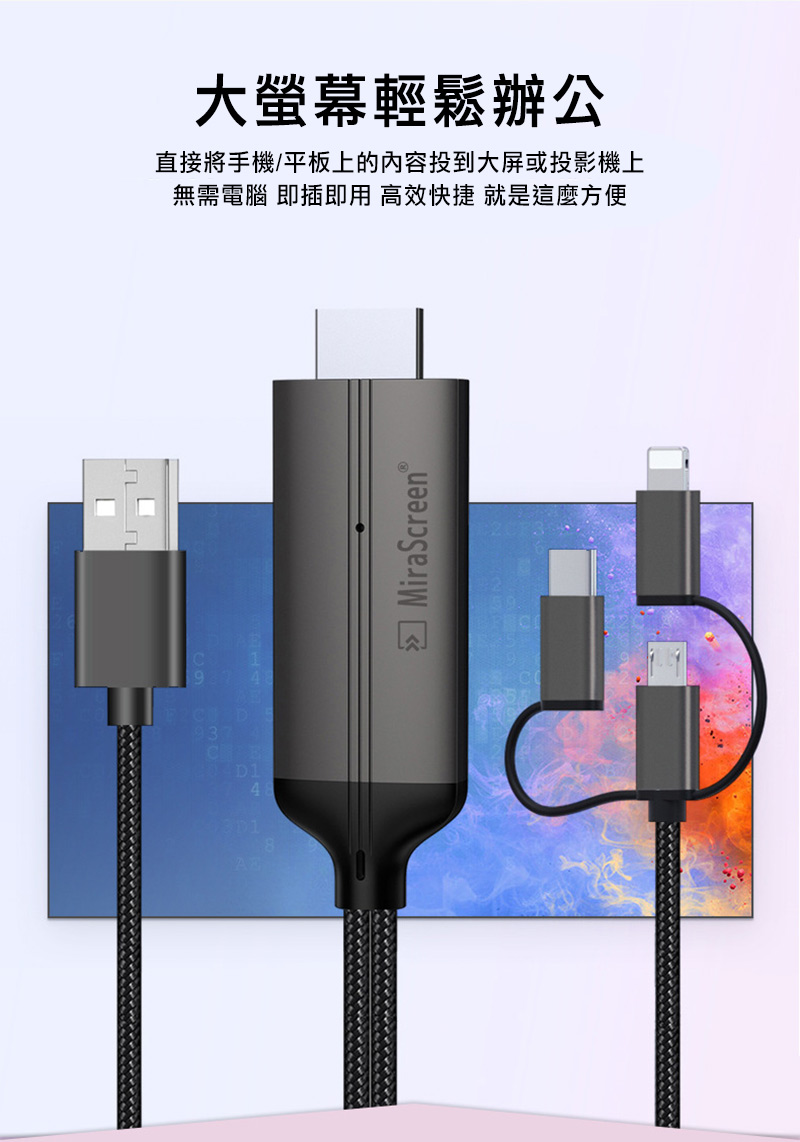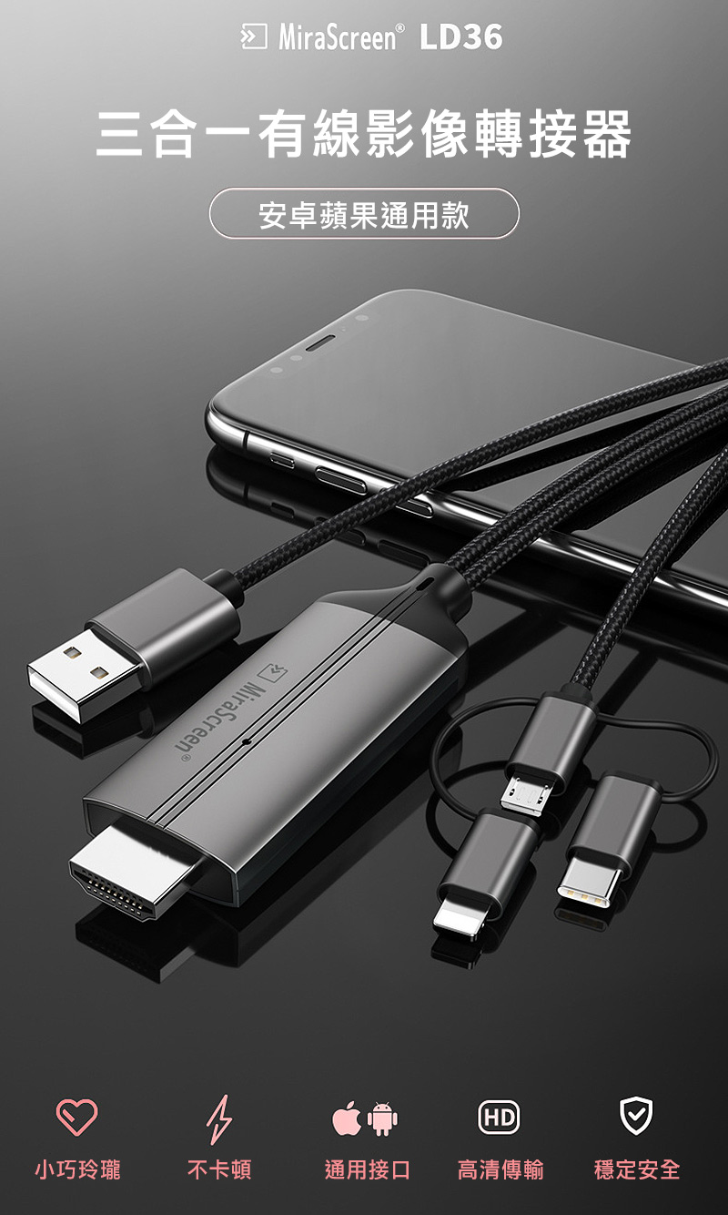 MiraScreen LD36 三合一有線影像轉接器(Lightning/Micro/Type-C)