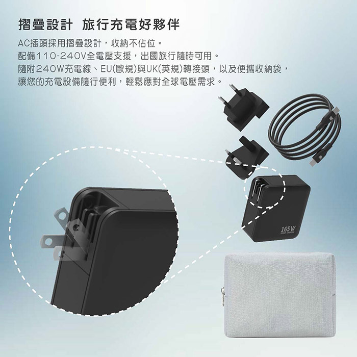 輕鬆摺疊插頭,附贈 出國轉接頭(歐規及英規)、240W USB-C充電線、收納袋