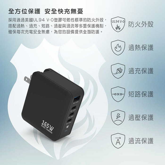 總輸出最大165W、氮化鎵晶片技術、外殼防火等級