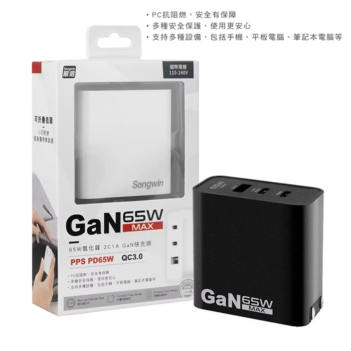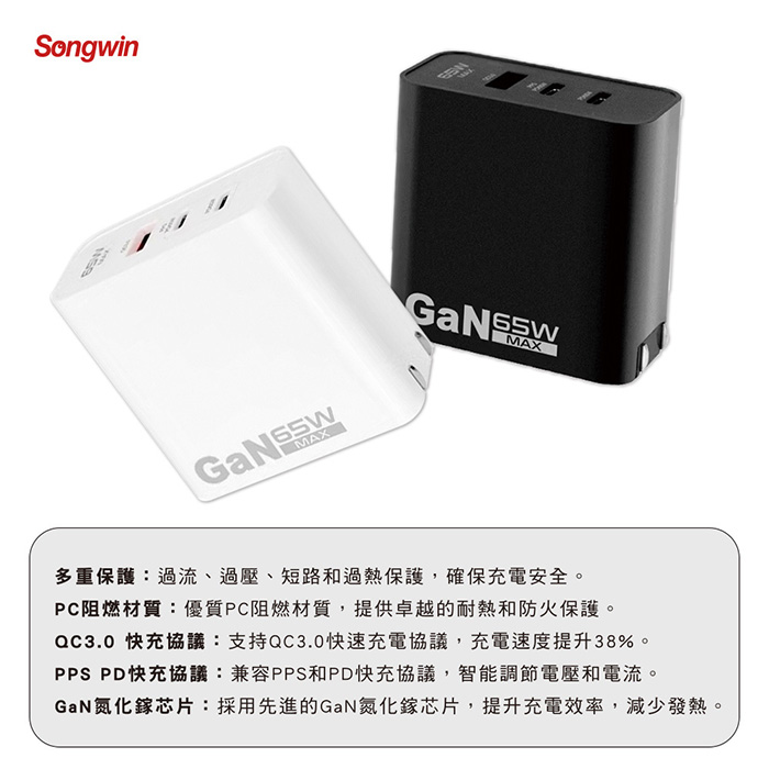 【Songwin】GaN氮化鎵 65W 手機平板快速充電器(雙USB-C+USB-A)