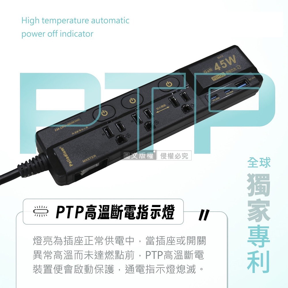 Palladium 氮化鎵GaN PD45W閃充延長線 按壓式4開3插3P USB/Type-C 110V專用(1.8m)