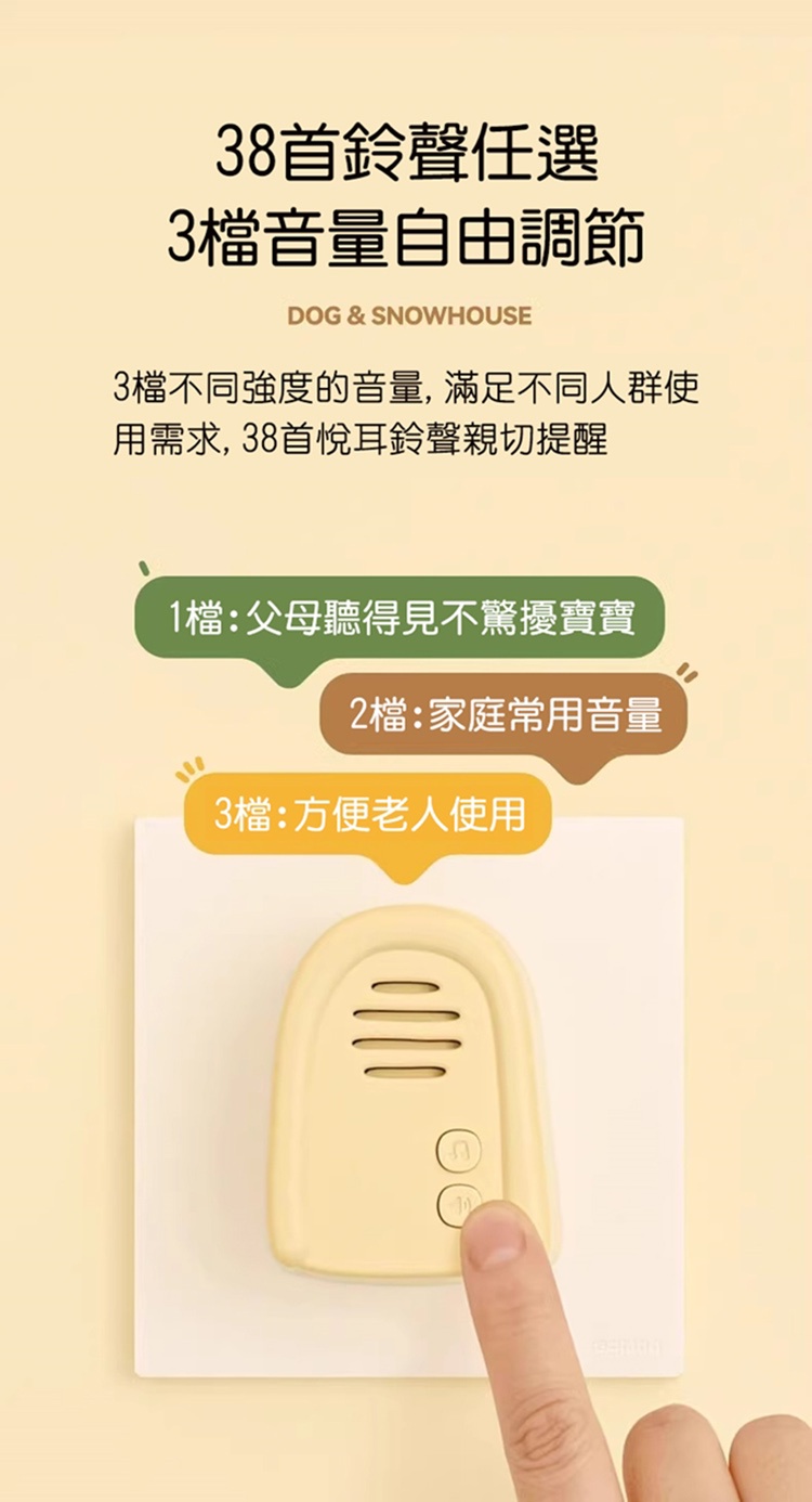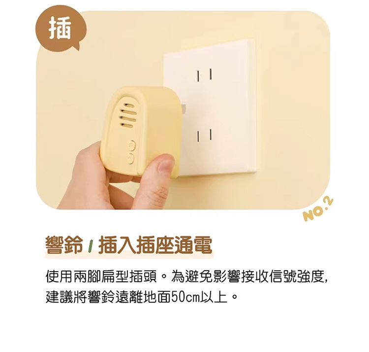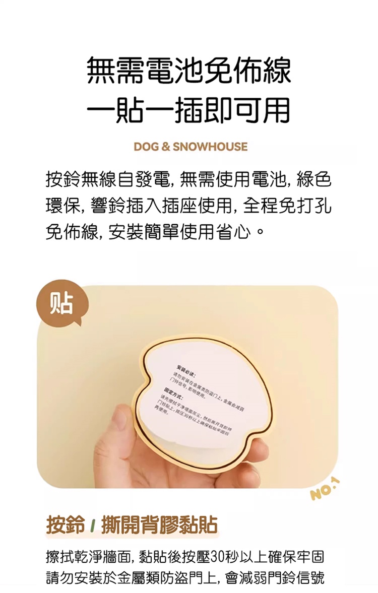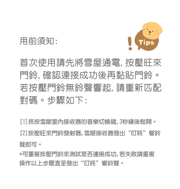 注:首次使用請先將雪屋通電,按壓旺來門鈴,確認連接成功後再黏貼門鈴。若按壓門鈴無鈴聲響起,請重新匹配對碼。
