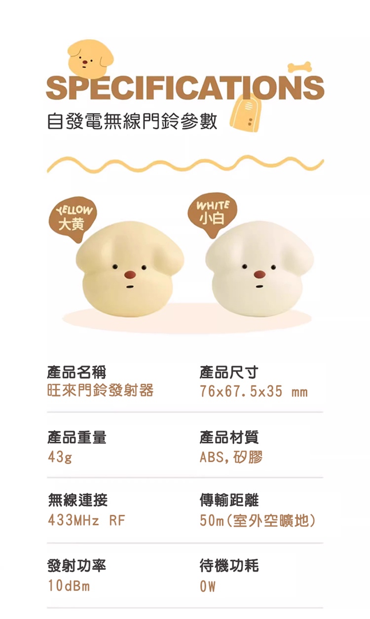 產品尺寸:76x67.5x35mm(旺來門鈴發射器),59x46x48.5mm(雪屋室內接收器)