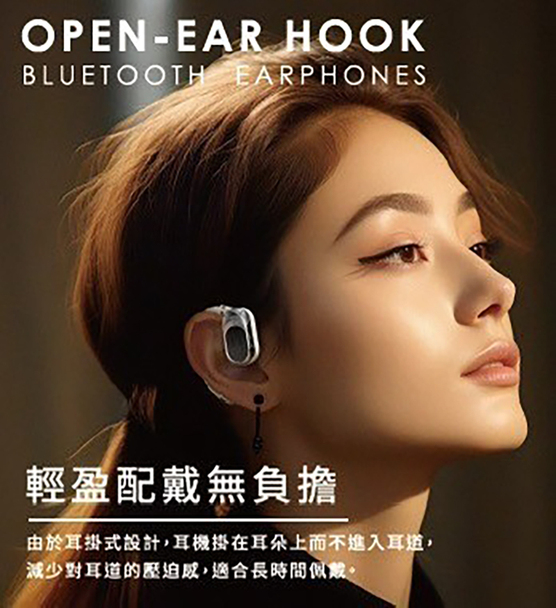 .開放式耳機設計,耳機掛在耳朵上而不進入耳道減少對耳道的壓迫感,適合長時間配戴
