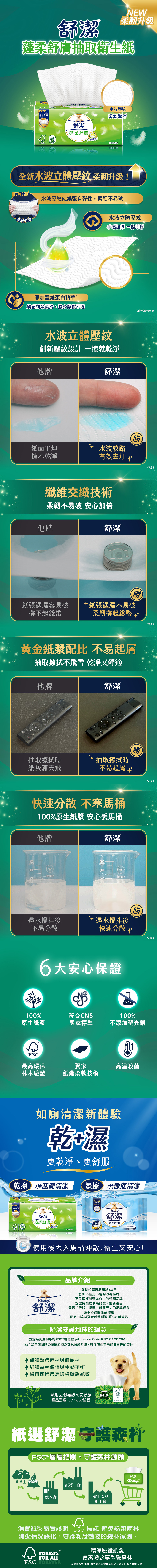 .舒潔抽取式衛生紙,添加蠶絲蛋白精華,觸感細緻柔滑,減少摩擦不適