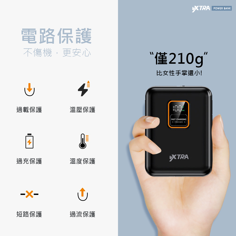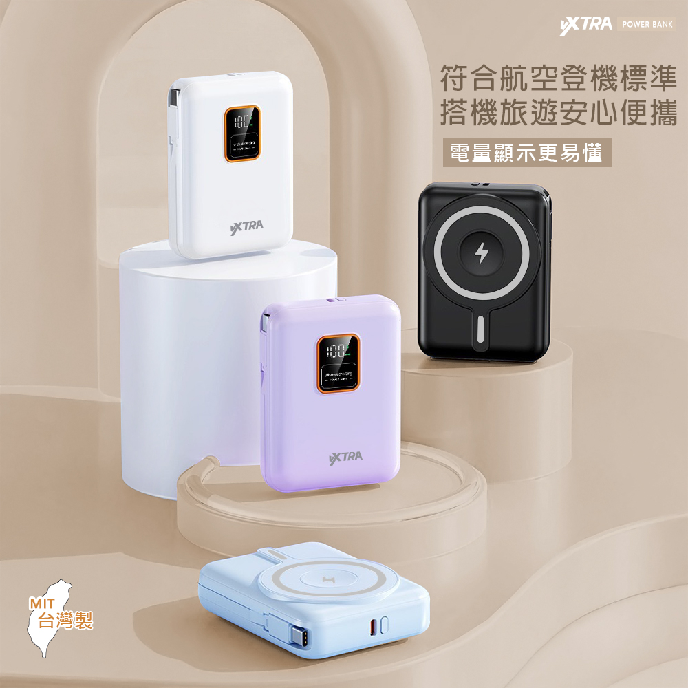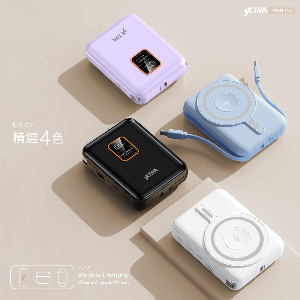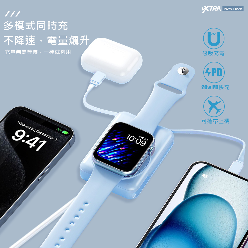 VXTRA 10000mAh電量顯示+自帶雙線 MagSafe磁吸無線快充 三用快充行動電源-淺藍