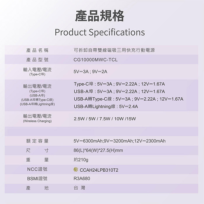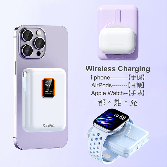KooPin 磁吸三用 可拆式雙出線 10000mAh 快充行動電源(台灣製造) 夢幻紫