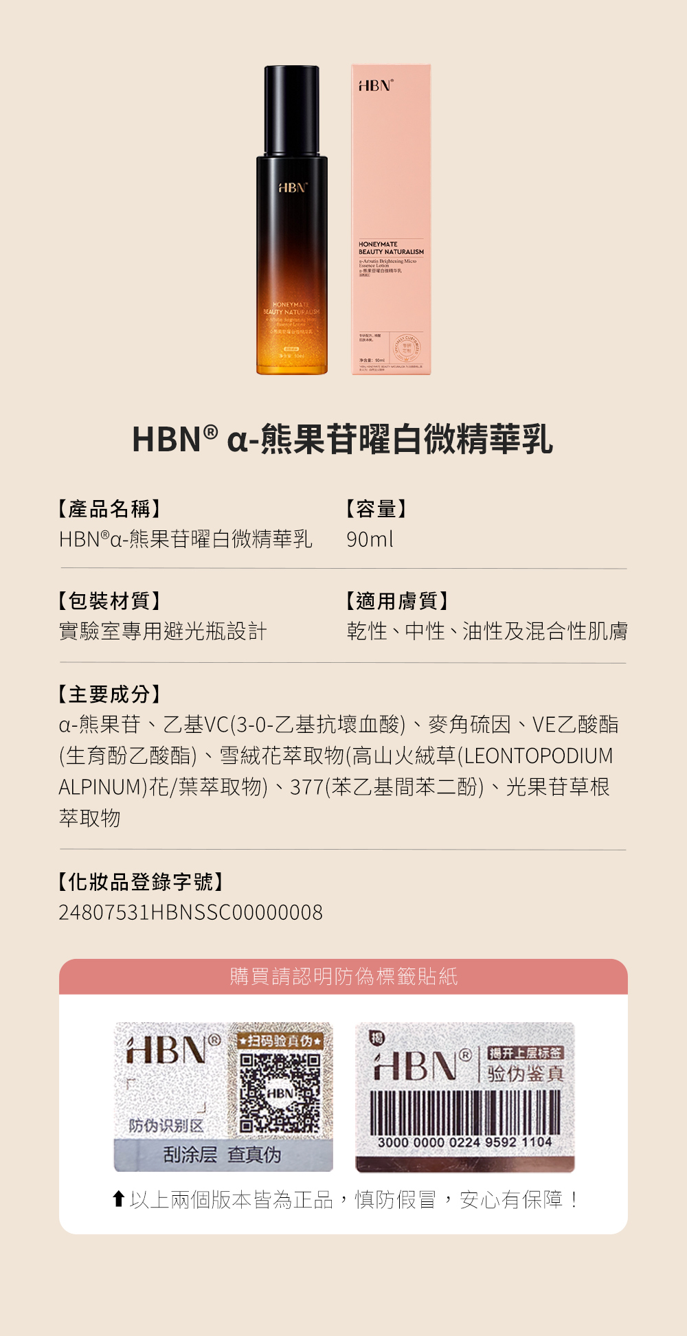 品名:【HBN】α-熊果苷曜白微精華乳 90ml (原白乳)