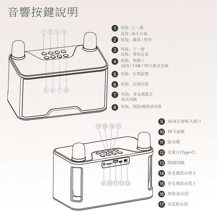 ◎多種功能:無線麥克風/無線播放/USB/TF卡/AUX輸入