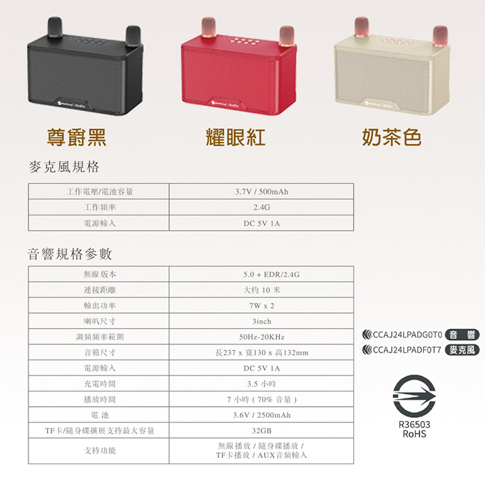 ◎藍牙版本V5.0 +EDR/2.4G,無線連接隨時唱