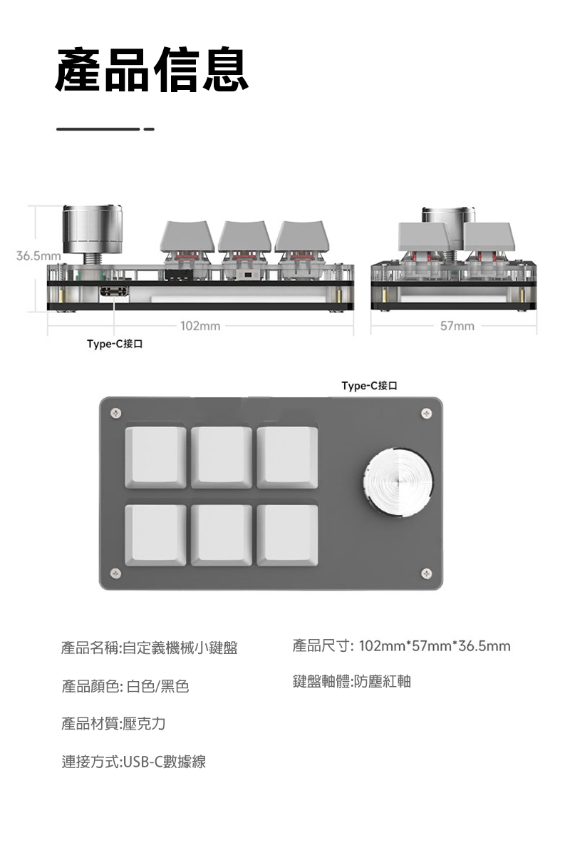 SIKAI 六鍵+旋鈕自定義有線鍵盤(白色)(RGB)可自定義 複製 貼上 快速輸入
