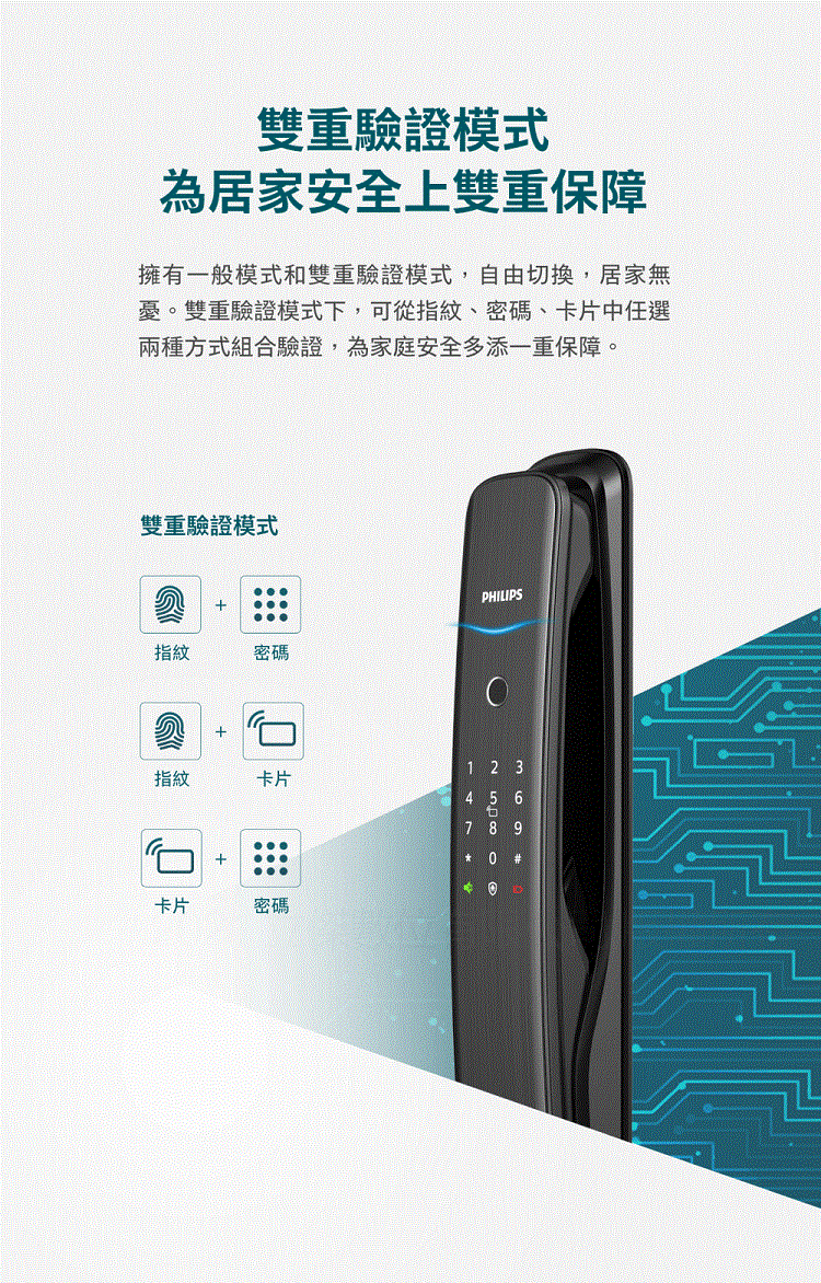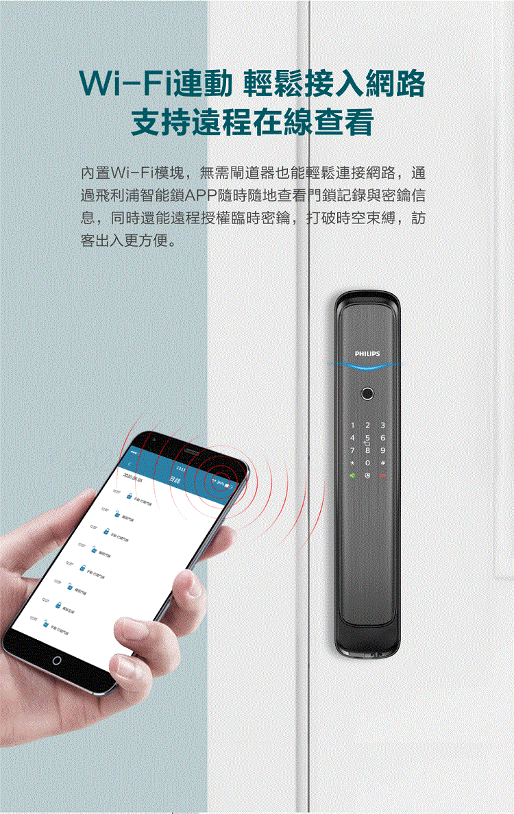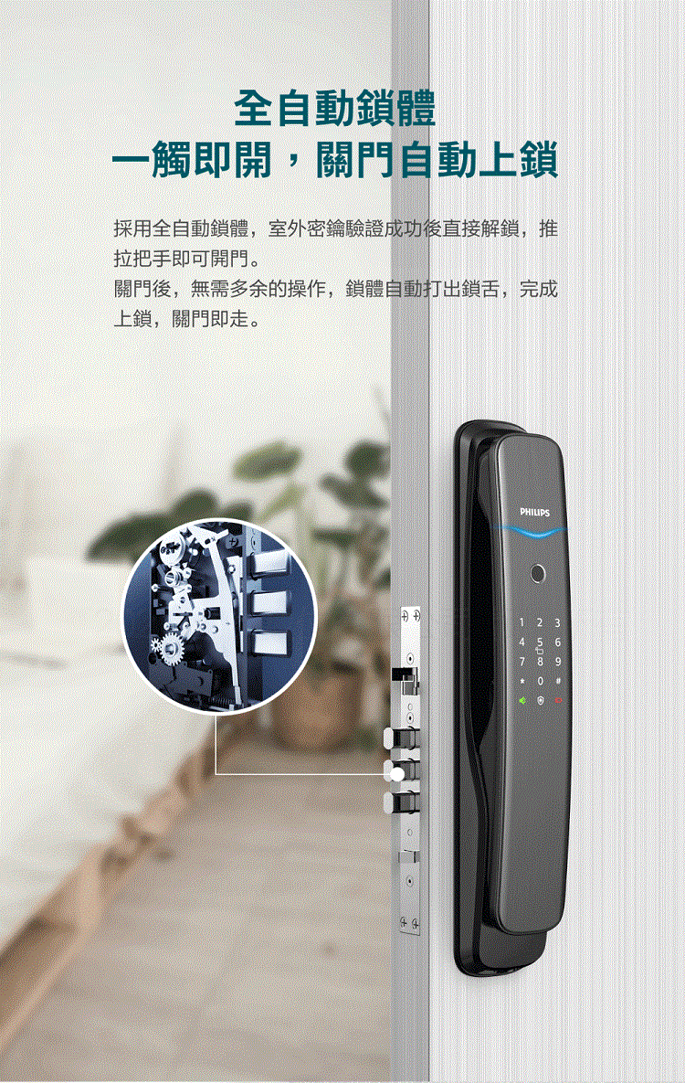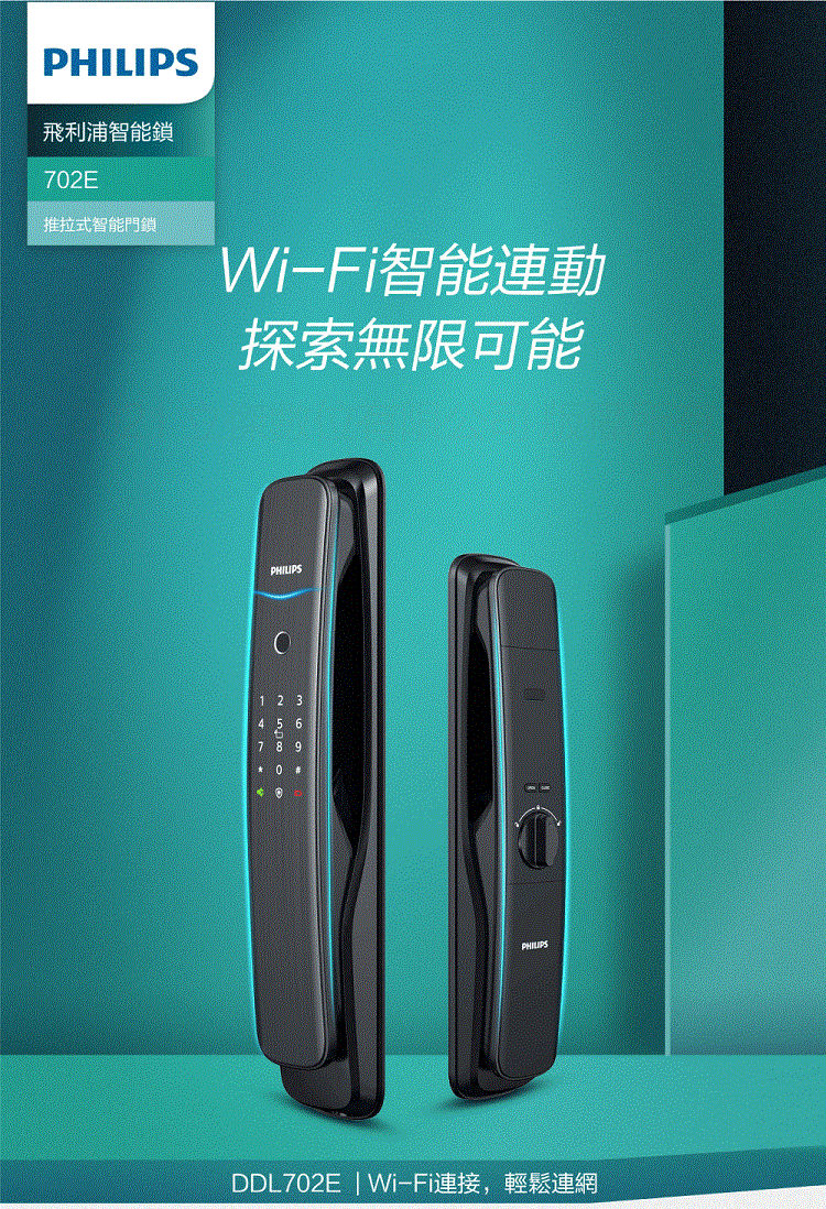 【PHILIPS 飛利浦】702E 五合一推拉式聯網電子鎖(指紋│卡片│密碼│鑰匙│WiFi/含安裝)