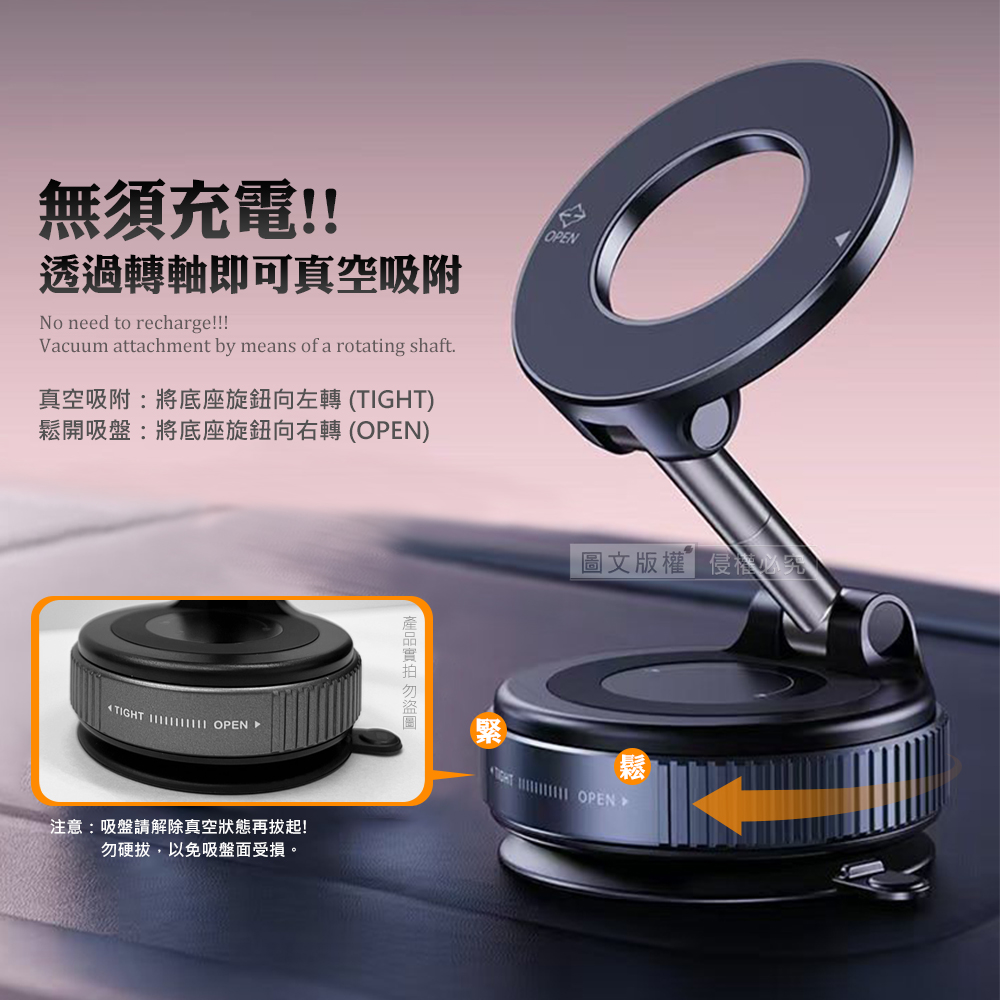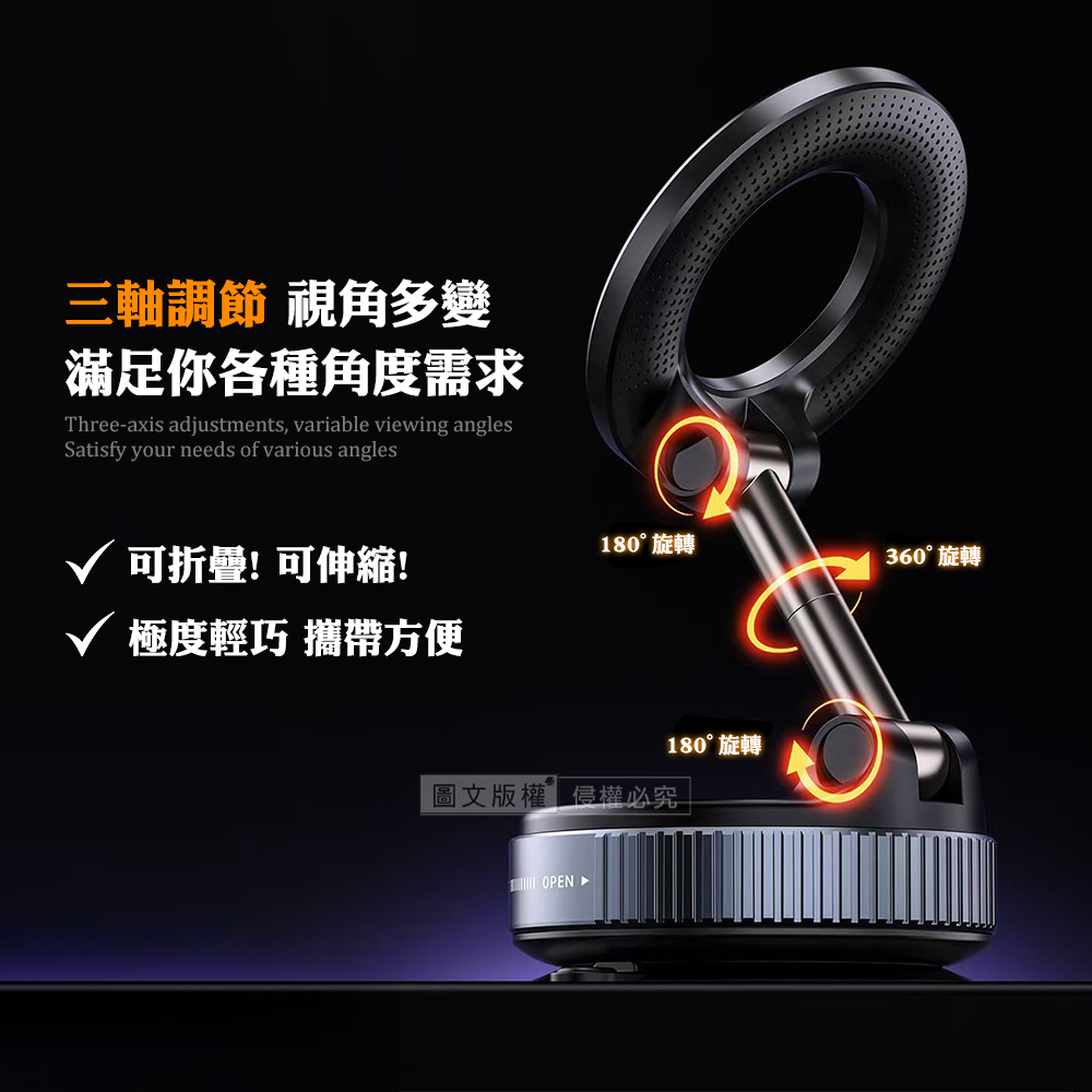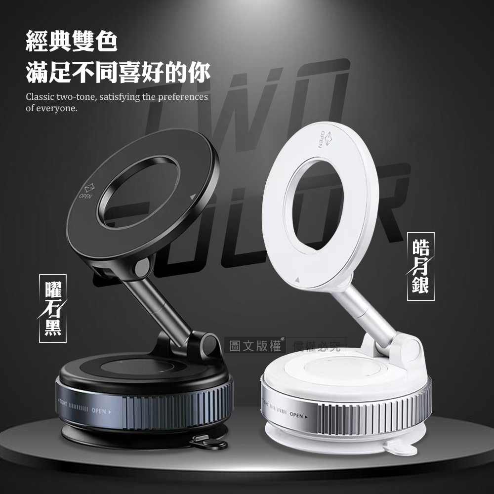 黑曜Pro N52 超強力磁吸手機架 360°旋轉可折疊 真空吸附支架 車架/桌上立架(曜石黑)