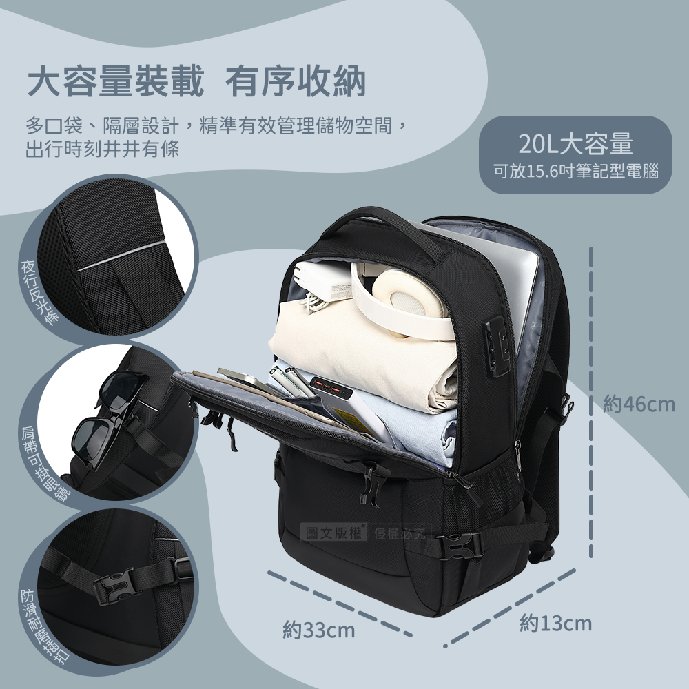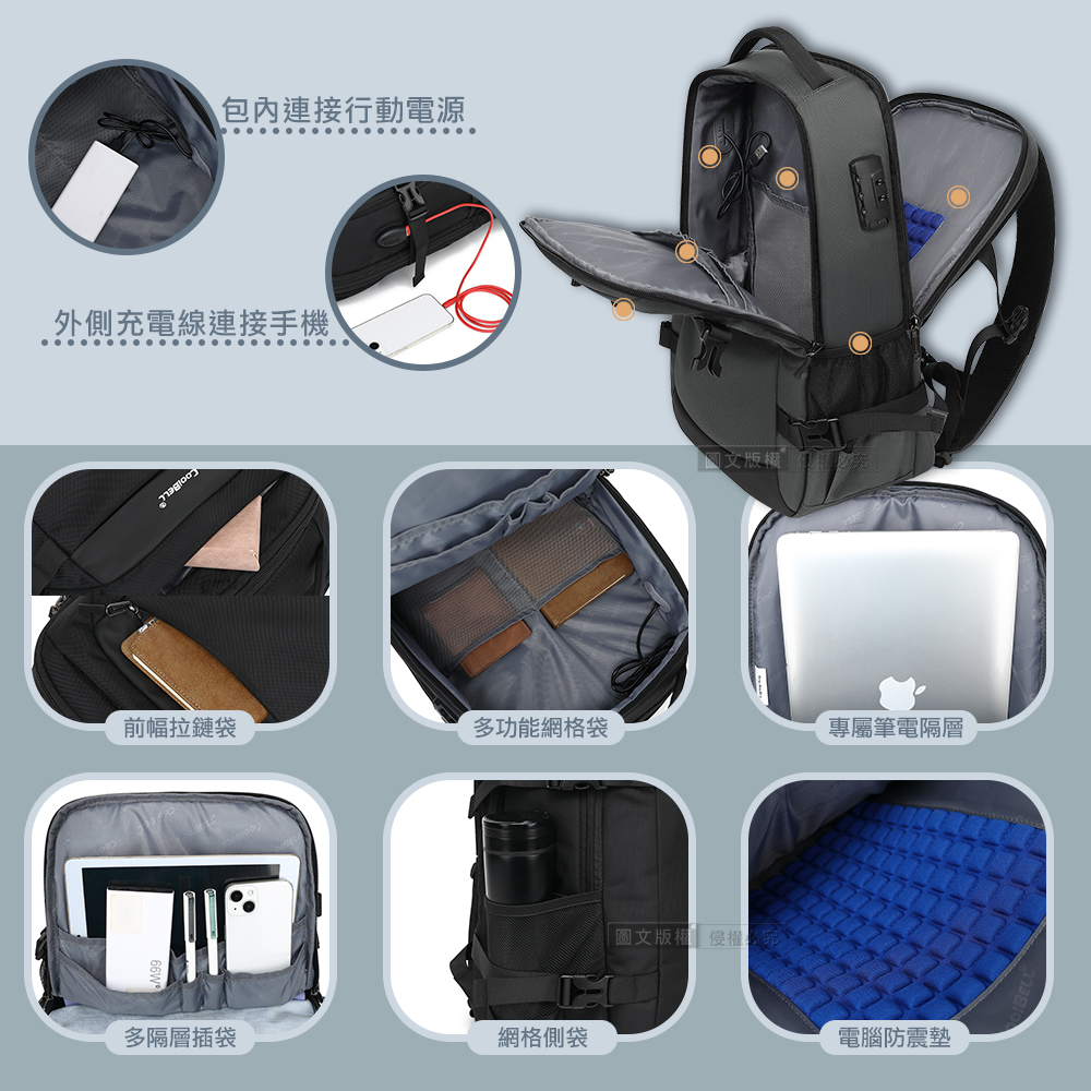 男士魅力 15.6吋 立體商務電腦後背包 防盜密碼鎖 大空量多隔層 出行必備首選(灰色)