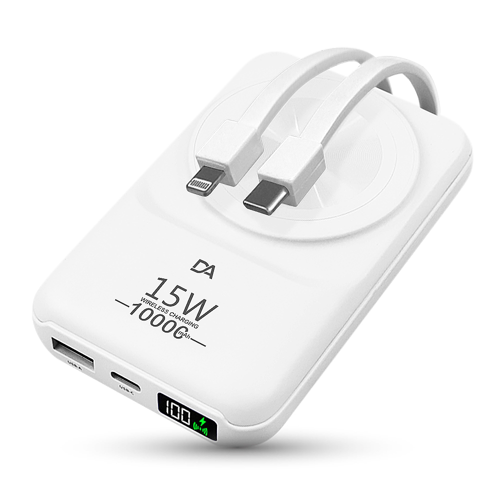 【DA】F58D 自帶雙線TypeC+Lightining+15W磁吸無線充電+數字顯示 多功能行動電源-白色