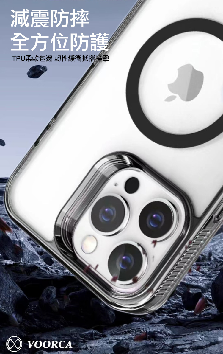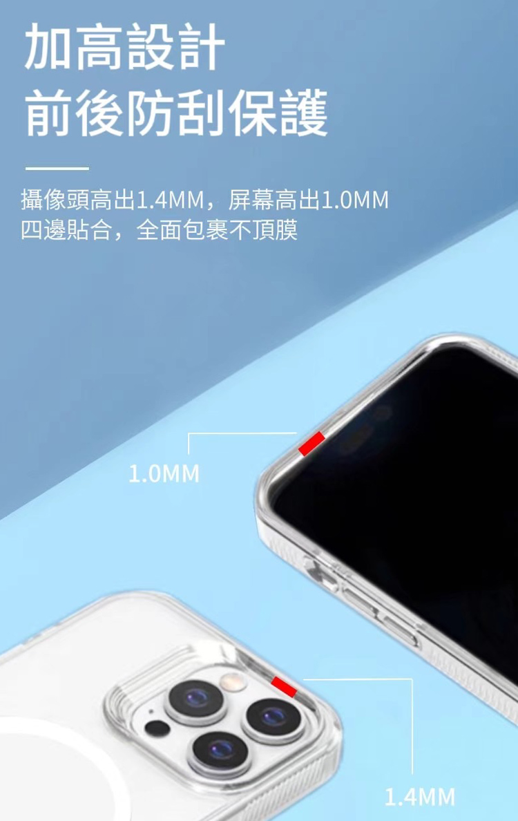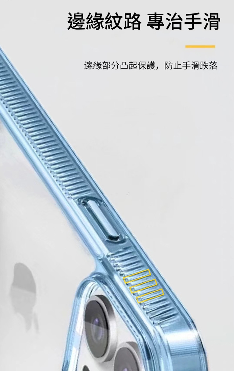 鏡頭周圍加高防護, 四角加上緩衝氣囊設計, 防震更耐摔