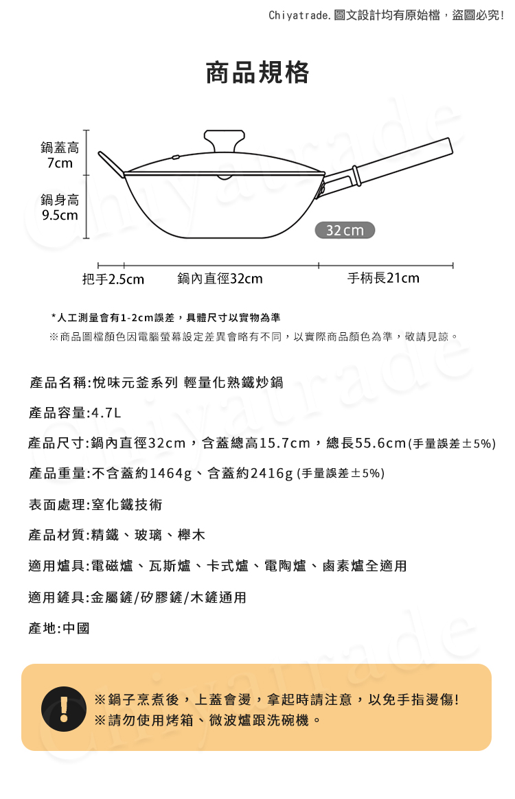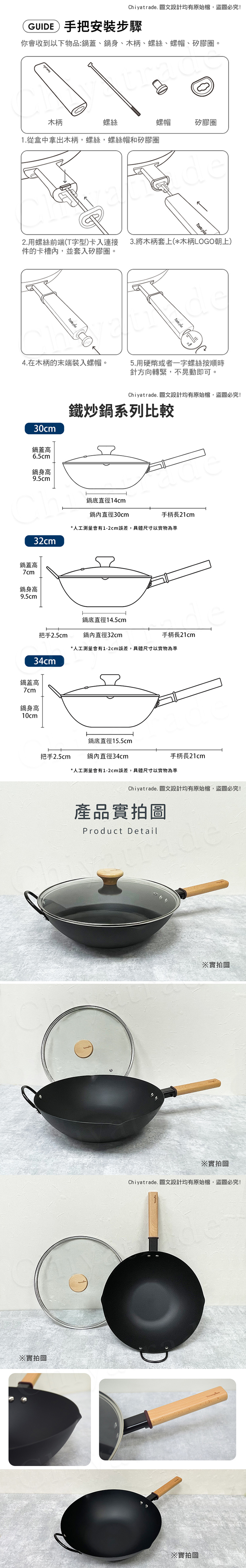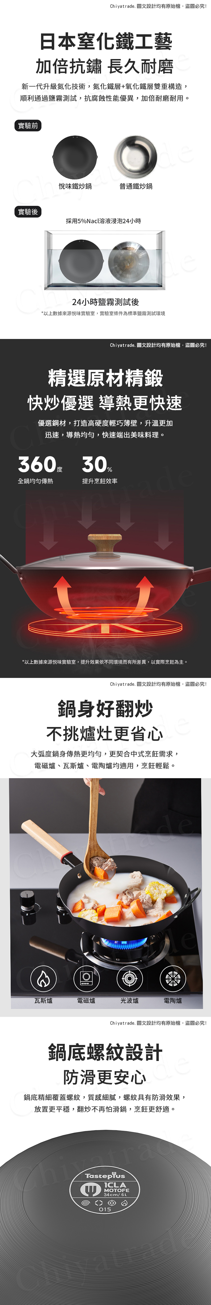 【Taste Plus】悅味元鐵 窒化鐵 無塗層 中式中華炒鍋 輕量化鐵鍋 32cm IH全對應設計(贈玻璃鍋蓋)