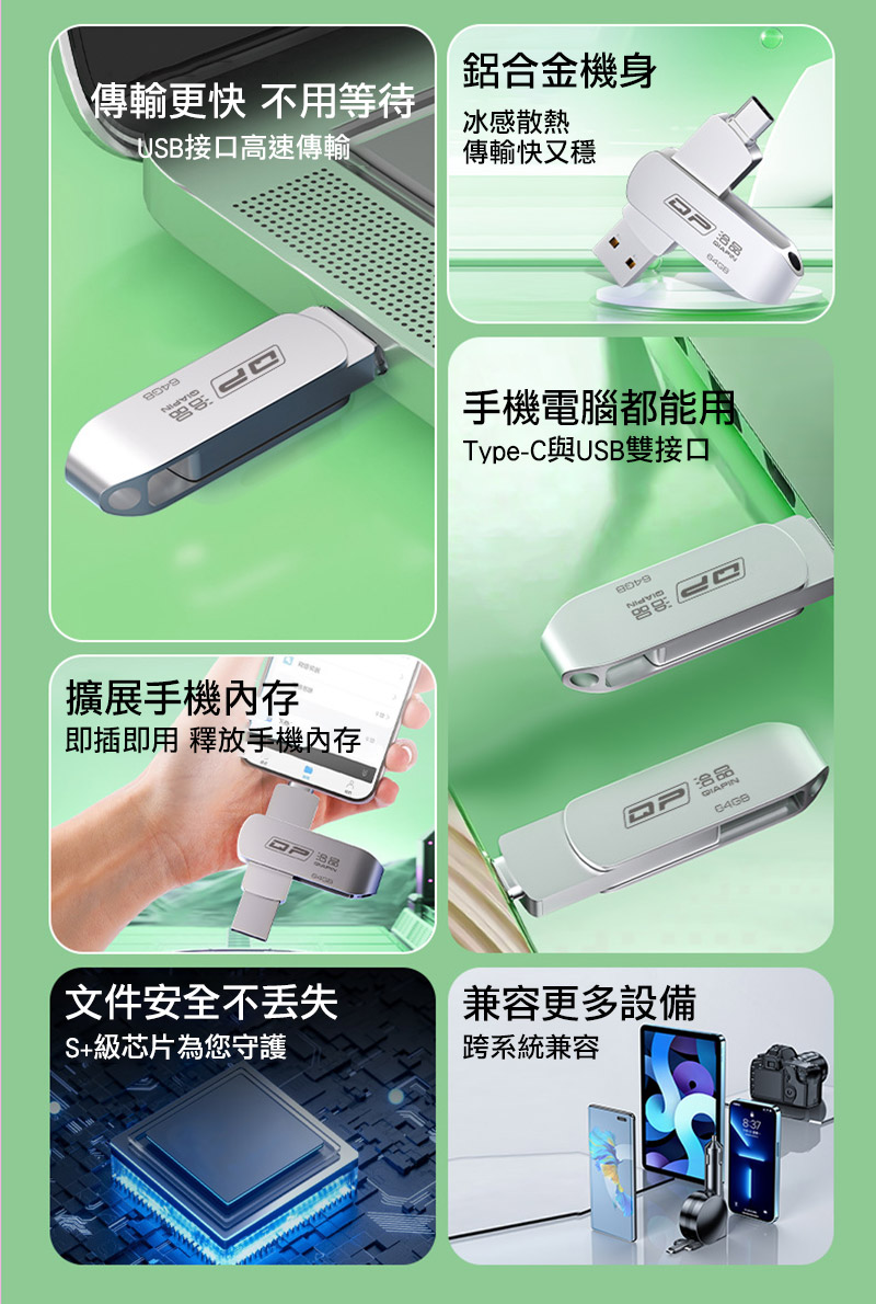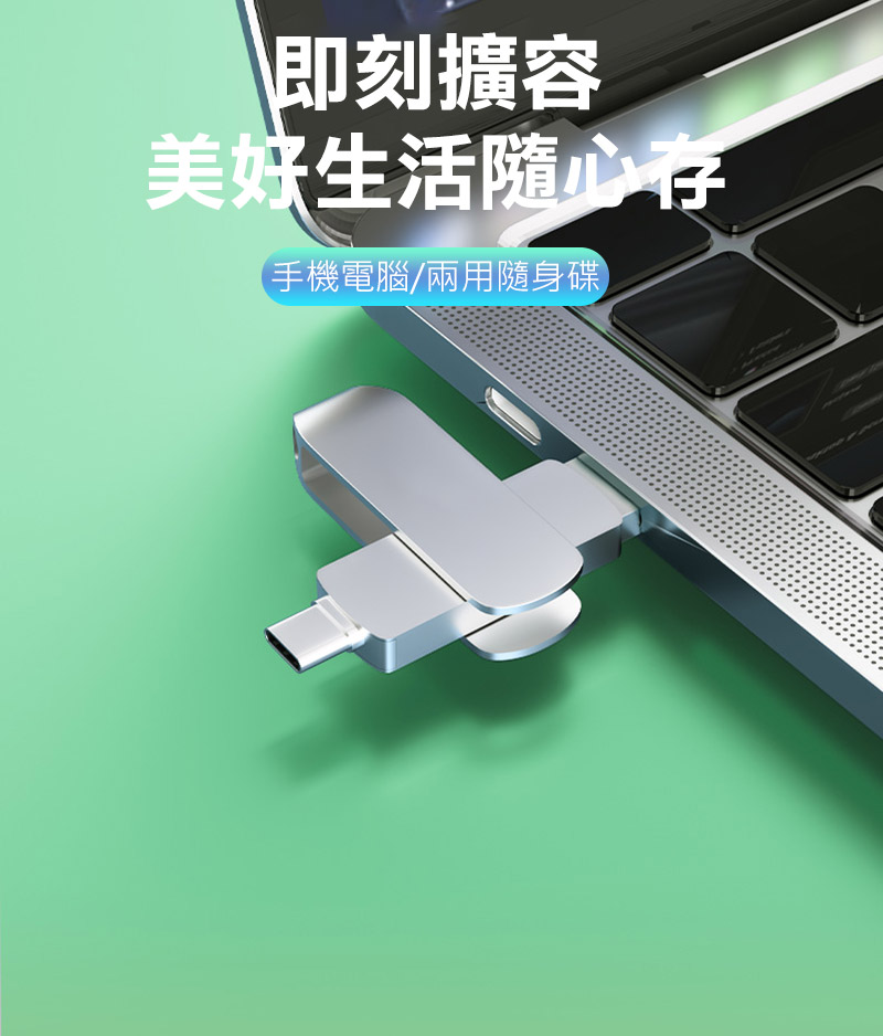 .金屬機身,冰感散熱,傳輸快速 .手機/平板 Type-C 連接埠,支援 OTG 即插即用 .旋轉式保護帽設計,不怕蓋子丟失