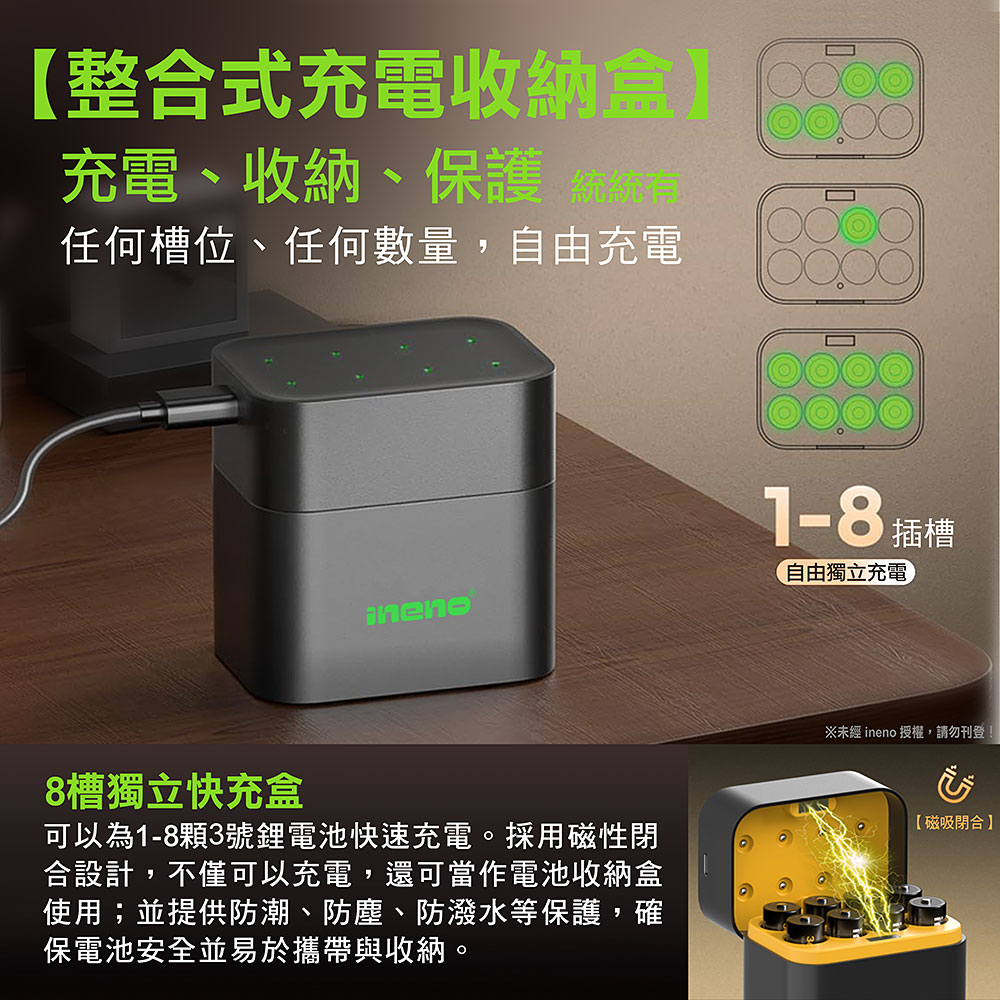 【ineno】3號/AA 恆壓可充式1.5V鋰電池全新特大能量3700mWh8入+(3號8槽)AI隨身收納盒充電器