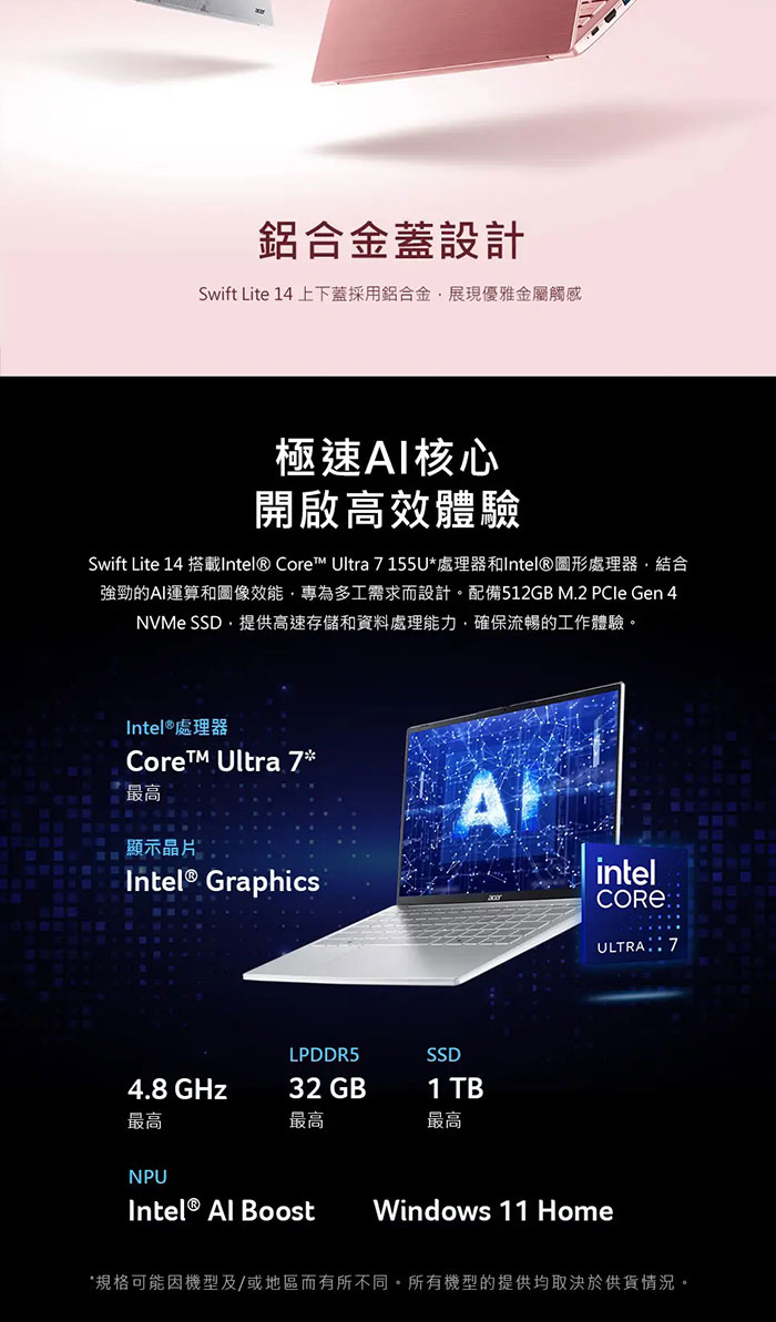 《Acer 宏碁》SFL14-54M-73E9(14吋WUXGA/Ultra 7 155U/32G/4TB PCIe SSD/Win11/特仕版)