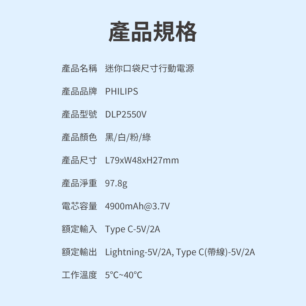• 飛利浦貼心多重安全防護:過充保護、過流保護、過放保護、電流偵測、過壓偵測、短路保護