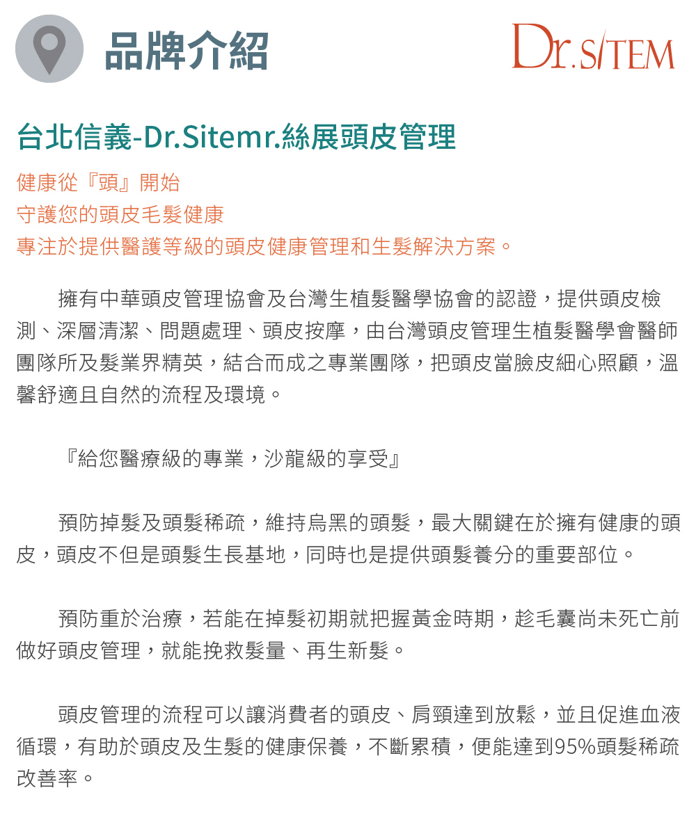 台北信義安和捷運站【Dr.SITEM絲展頭皮管理】功效性頭皮綜合管理體驗券(頭皮管理90分鐘+頭皮檢測30分鐘)(mo)