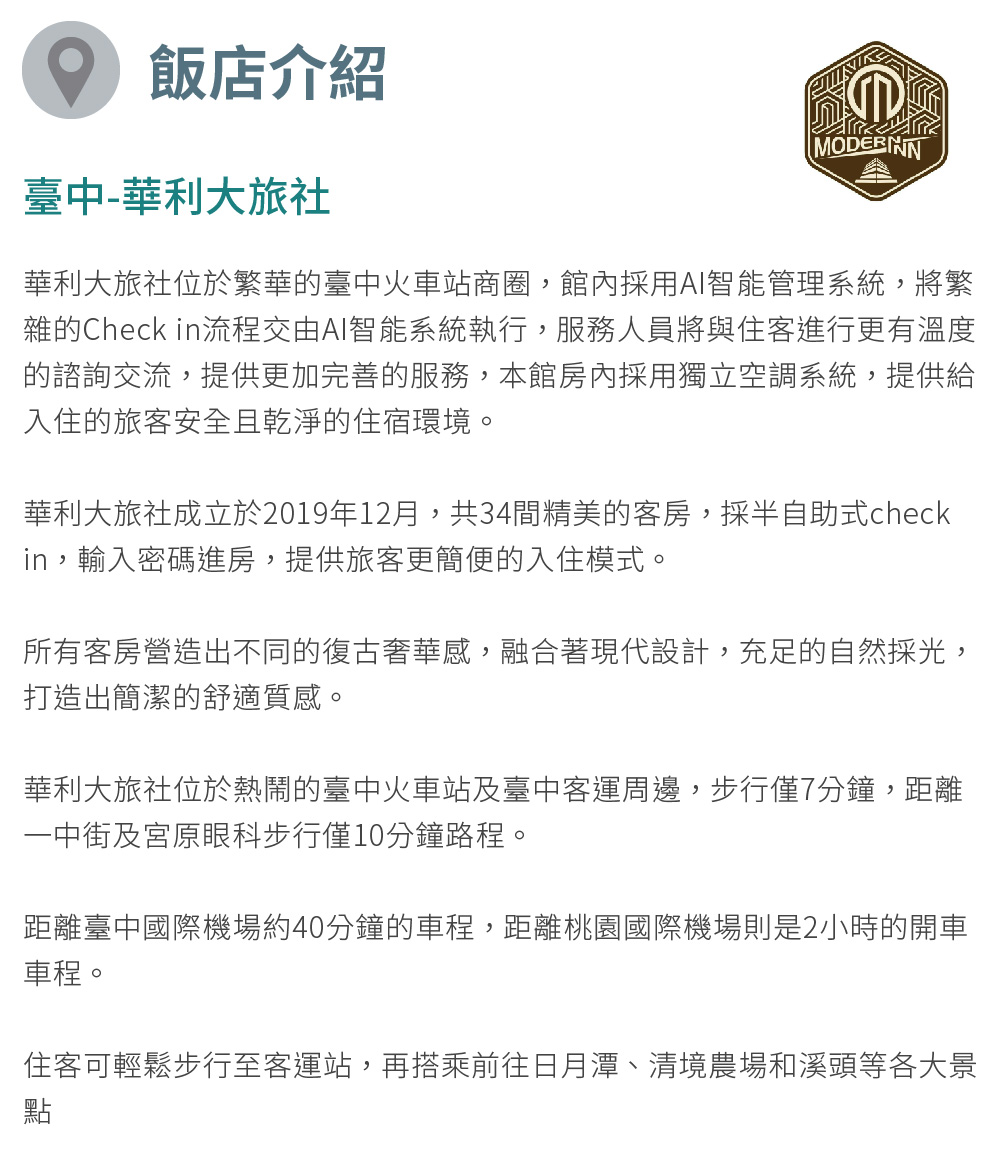 台中【華利大旅社】平日標準雙人房住宿券MO25