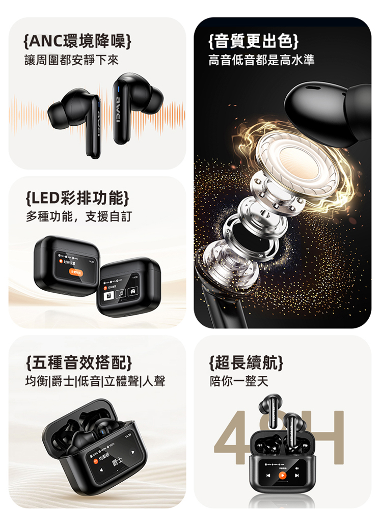 AWEI T56 備有一個直觀的LED觸控彩色螢幕,使用者可以輕鬆切換歌曲、調整音量或選擇不同的音效模式。這款耳機提供五種音效模式:均衡、爵士、低音、立體聲和人聲,讓您根據不同的音樂類型或偏好來自定義聽覺體驗。