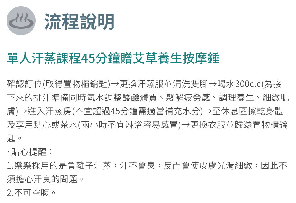 台北【樂樂汗蒸幕】單人汗蒸課程45分鐘贈艾草養生按摩錘(平假日) (25M0)