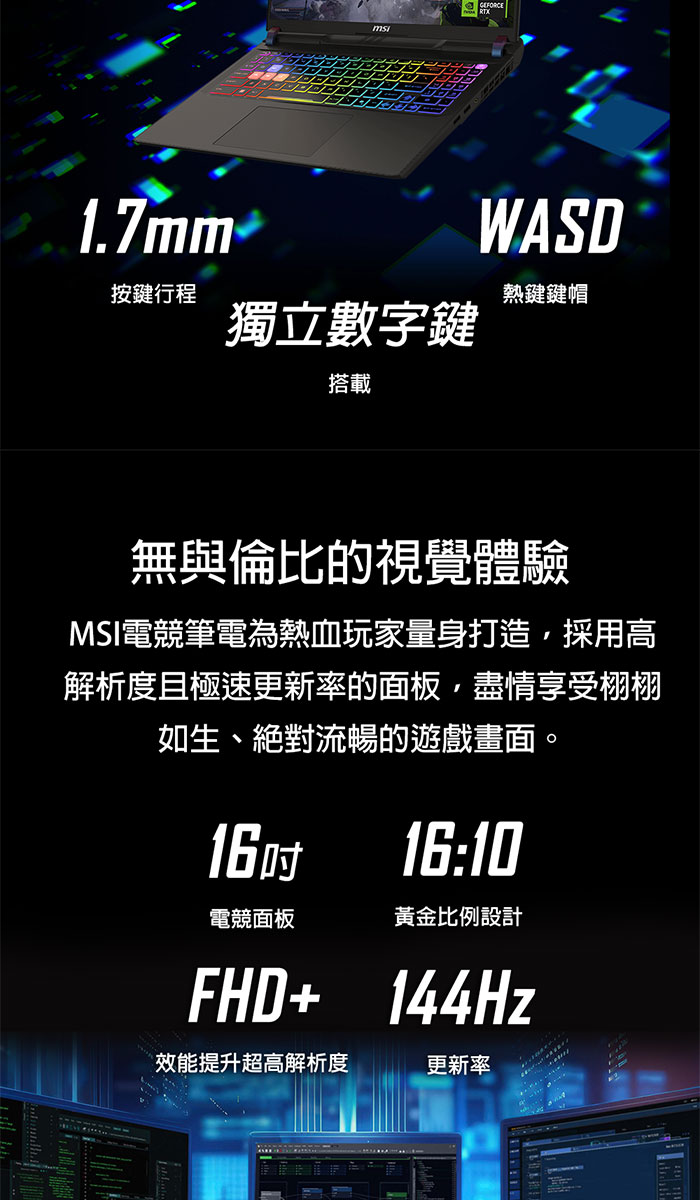 《MSI 微星》Vector 16 HX AI A2XWHG-049TW(16吋FHD+/U7 255HX/16G/512G/RTX5070Ti)