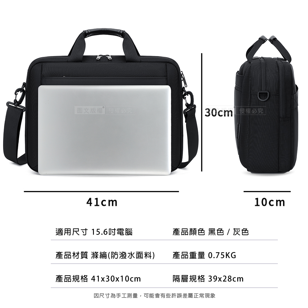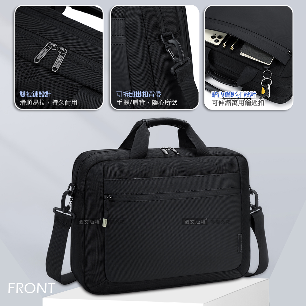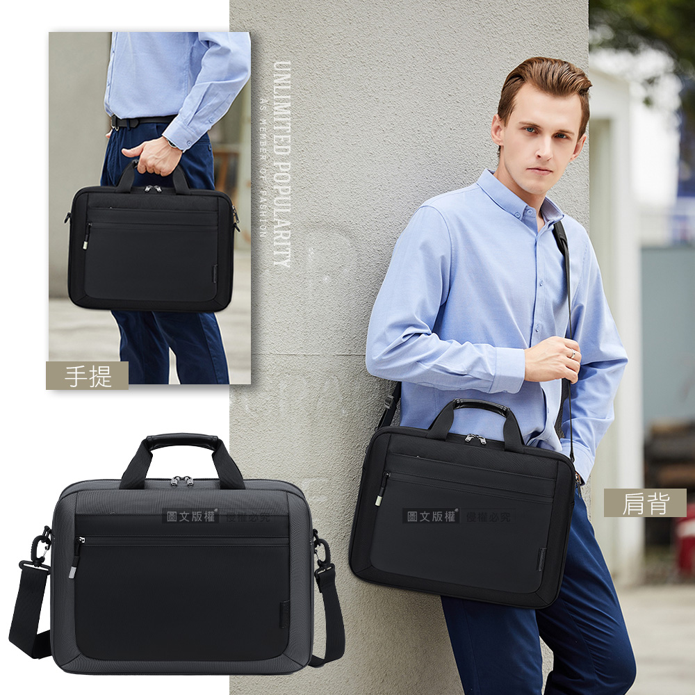 15.6吋 卓越領袖 肩背手提筆電公事包 大容量多夾層防潑水 內置氣囊防震 附背帶 伸縮鑰匙扣(灰色)