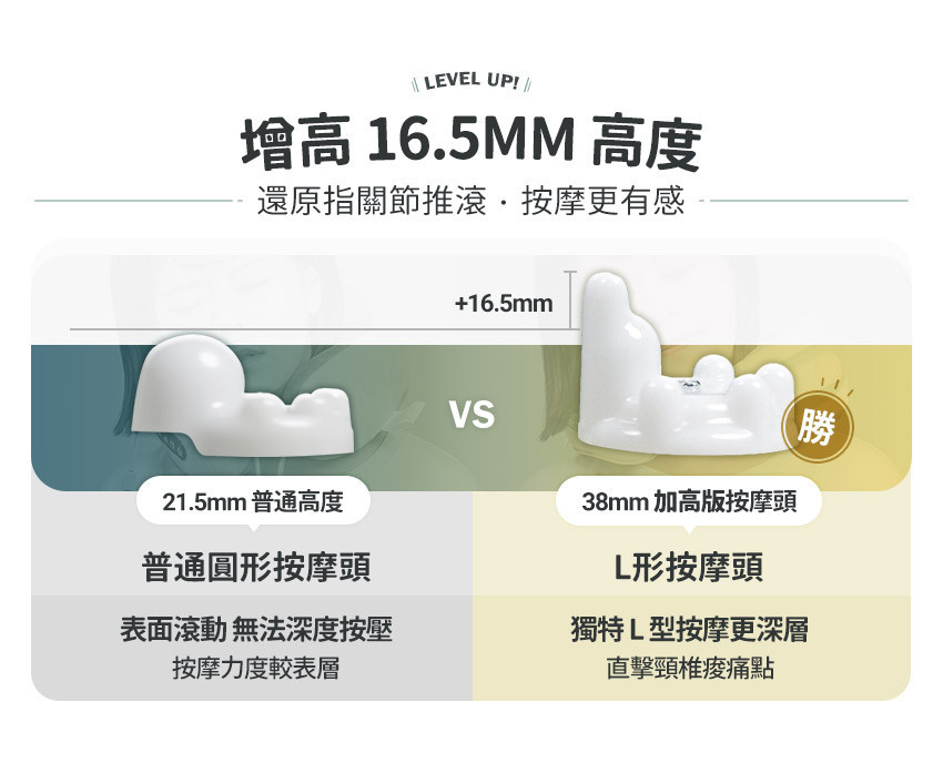 ❶ 仿虎口增高 L 型按摩頭,深層按摩更有力