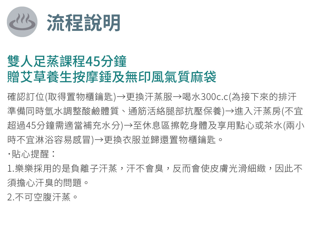 台北信義【樂樂汗蒸幕】雙人足蒸課程45分鐘贈艾草養生按摩錘及無印風氣質麻袋(平假日) (25M0)