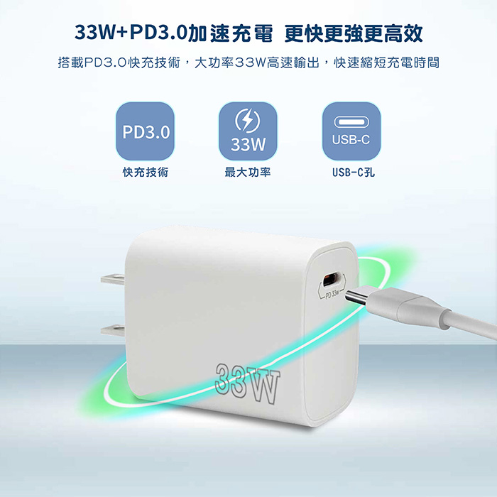 33W PD充電器小巧好攜帶,搭配正確線材即可快速的將設備充飽電力,