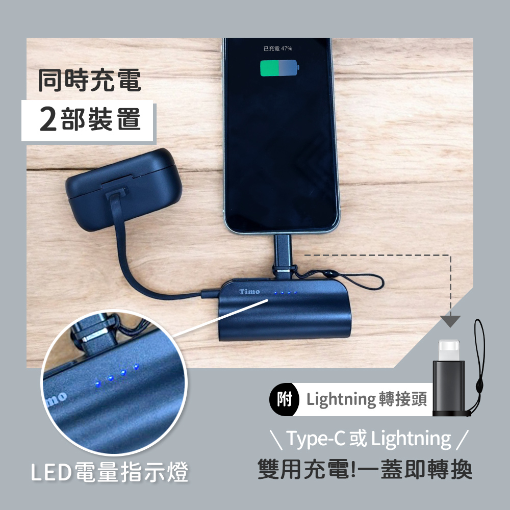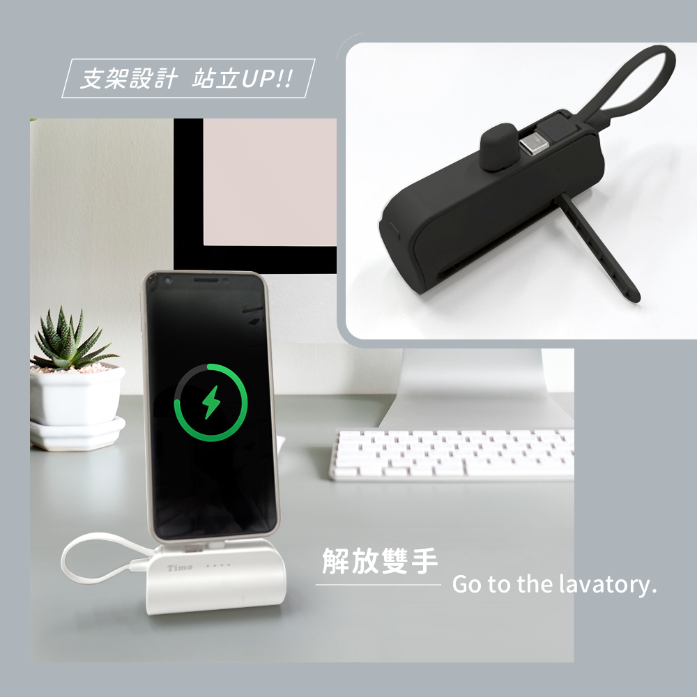 【Timo】Type-C直插式支架口袋行動電源5000mAh(內附Lightning轉接頭)(有標示Wh)_白色