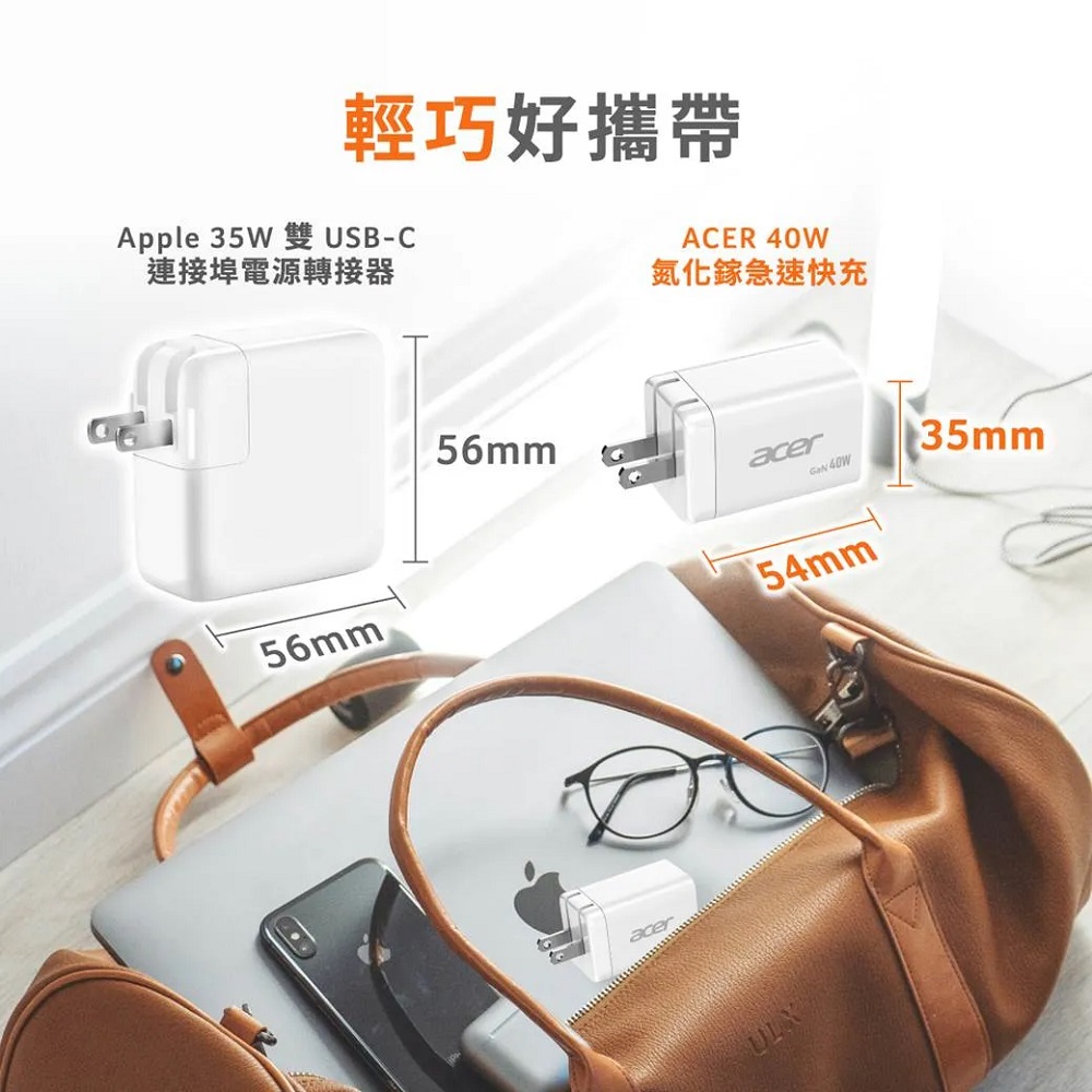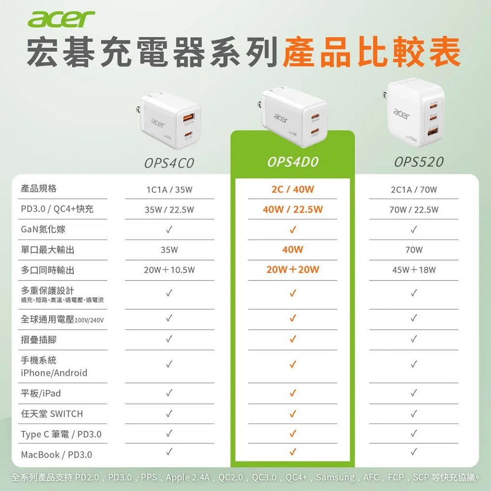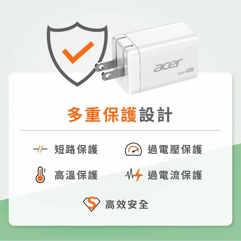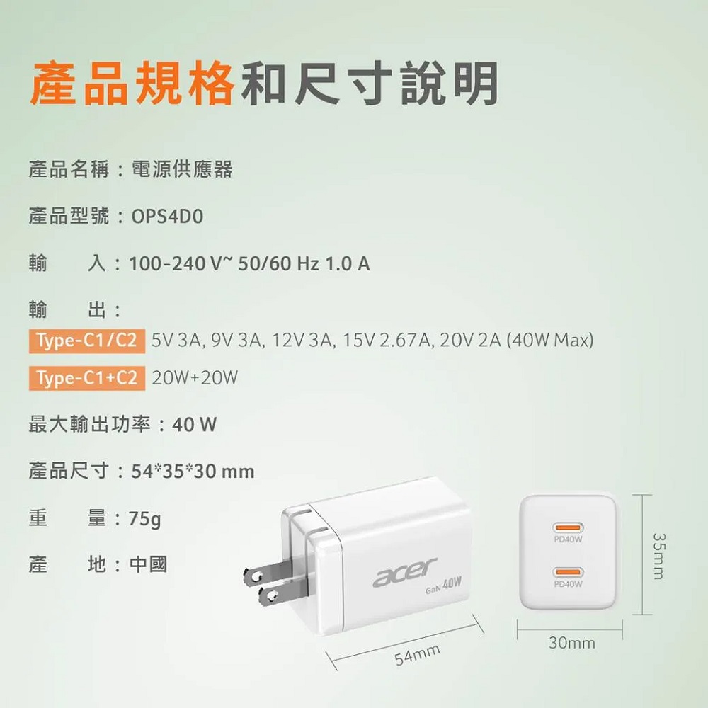 【Acer 宏碁】40W氮化鎵GaN急速快充充電器 OPS4D0 (Type-Cx2)