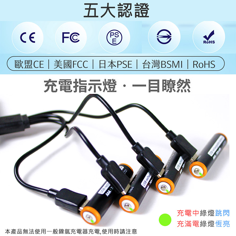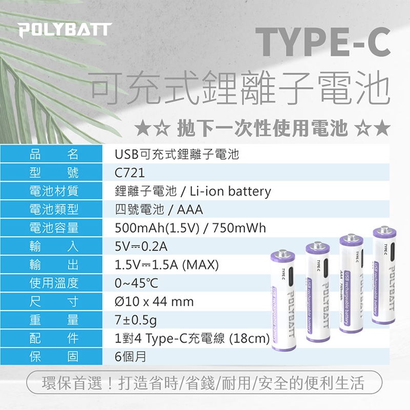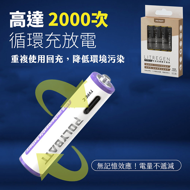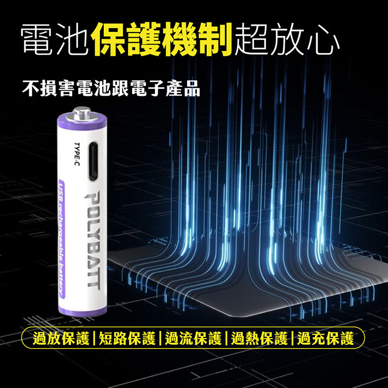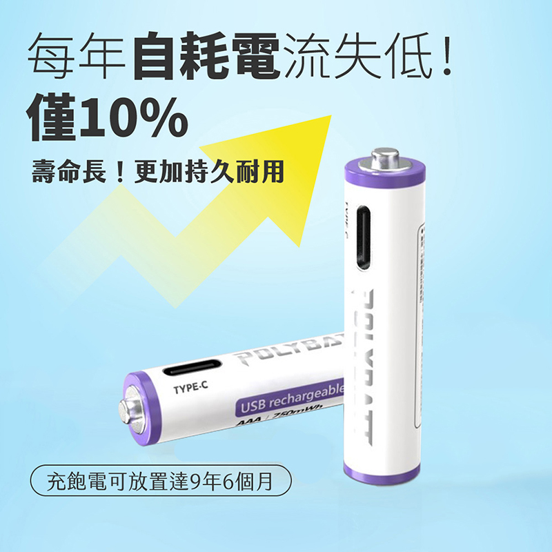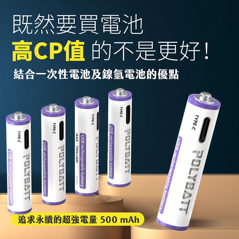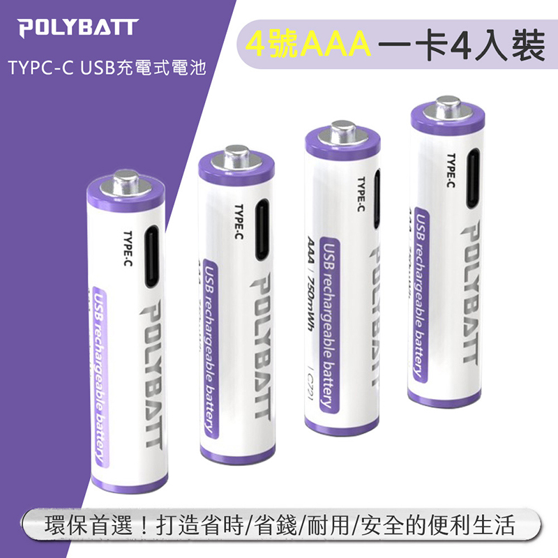 POLYBATT 4號 AAA 1.5V USB 充電式鋰電池(750mWh)