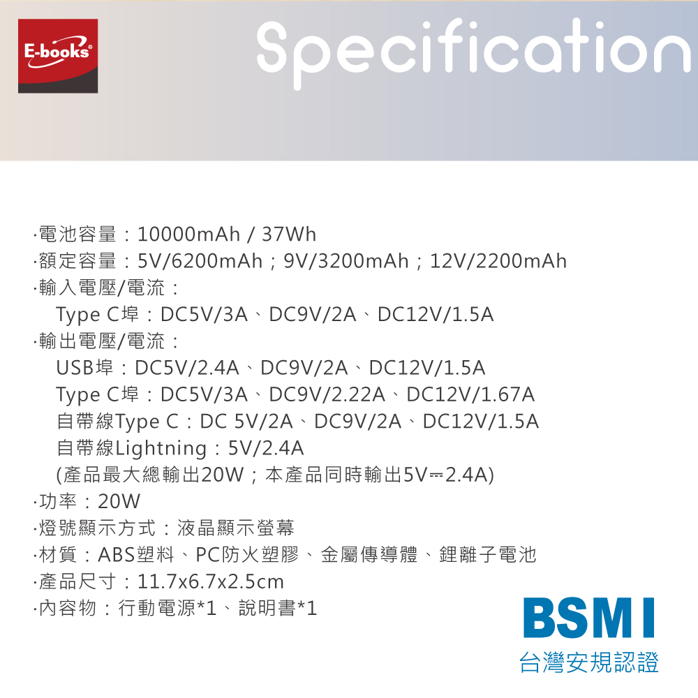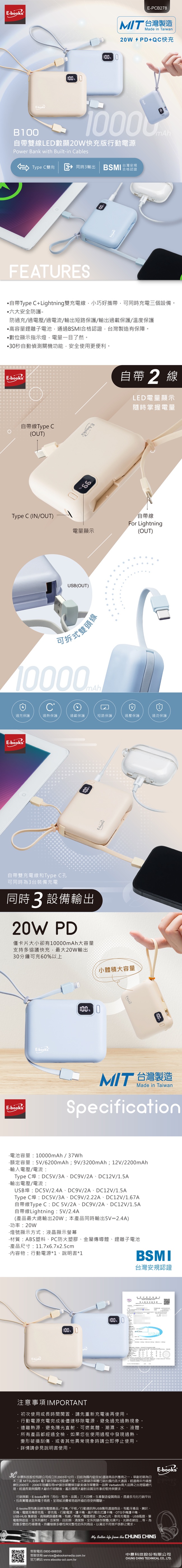 E-books B100【台灣製造】自帶雙線LED數顯20W快充版行動電源-奶茶