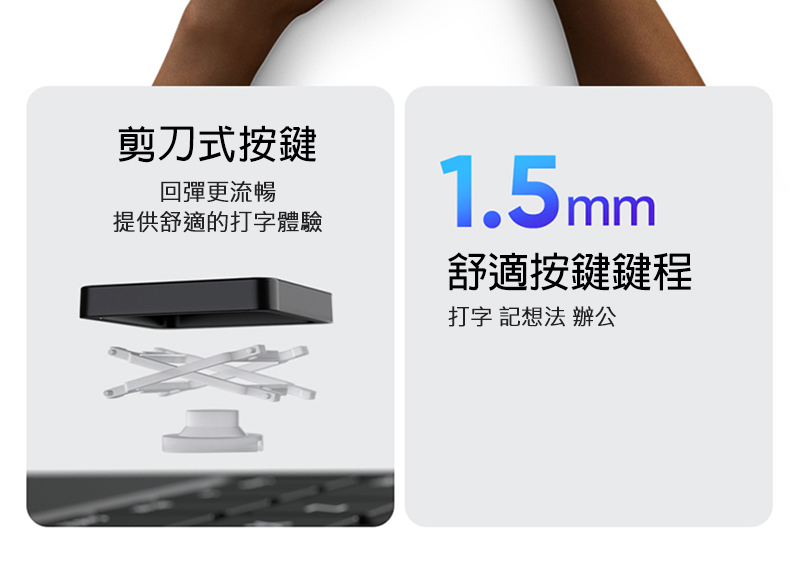 .剪刀式結構按鍵,回彈更流暢,1.5mm 鍵程,手感絕佳