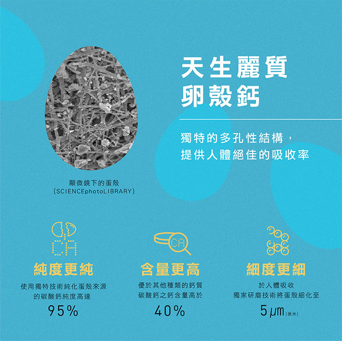 於人體吸收獨家研磨技術將蛋殼細化至5微米。