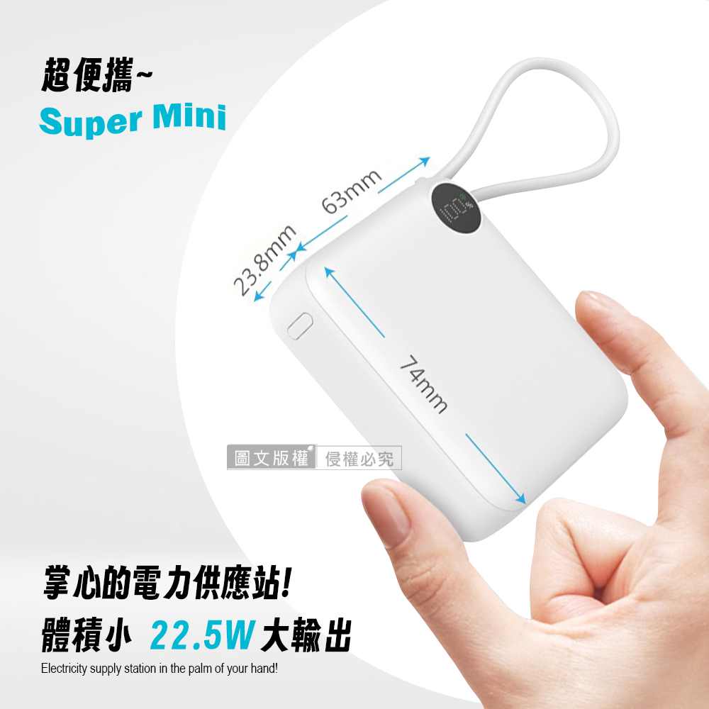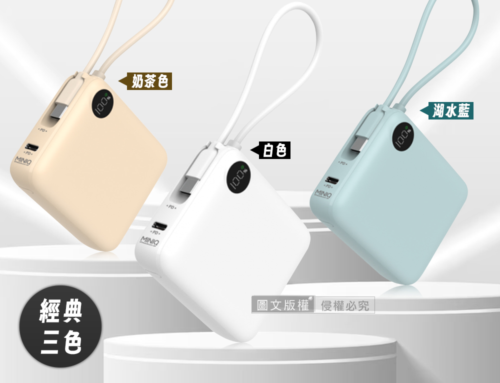 MINIQ 超迷你 10000mAh 自帶線閃充行動電源 支援PD/QC快充 數位顯示 台灣製 - 湖水藍