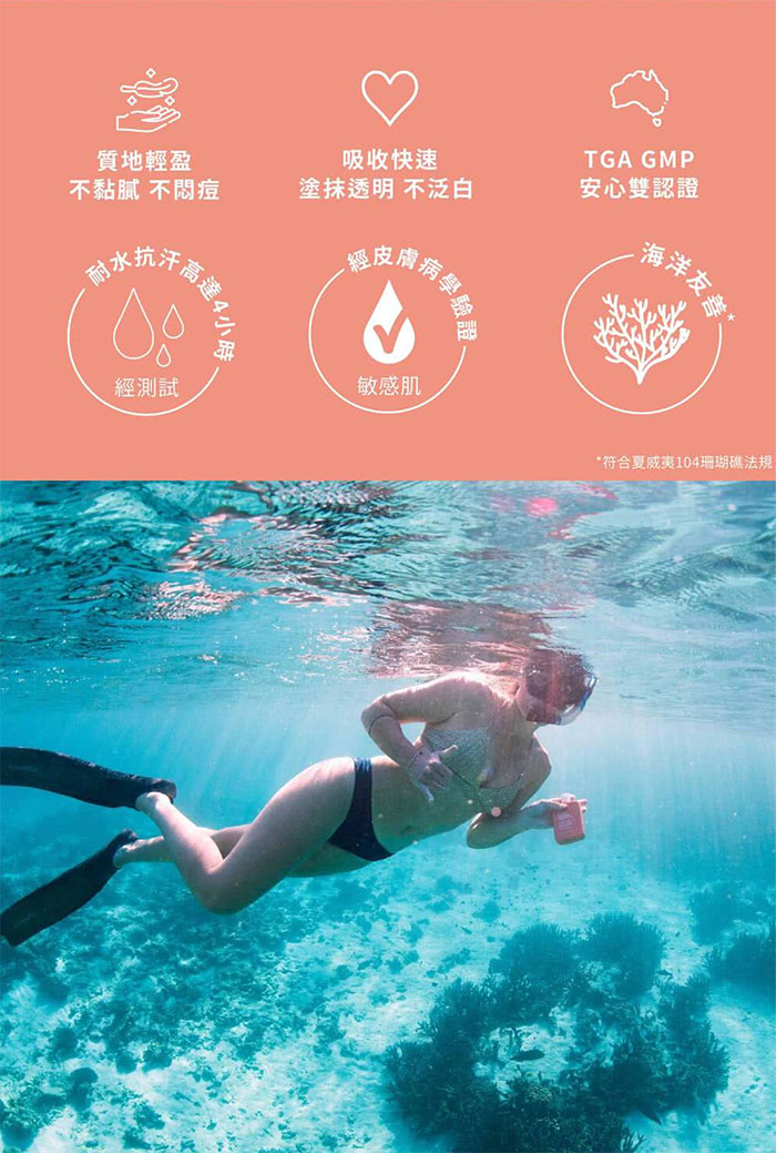 海洋友善 : 符合夏威夷海洋友善法規,不含香料、PABA、Parabens、 Oxybenzone、Octinoxate 。