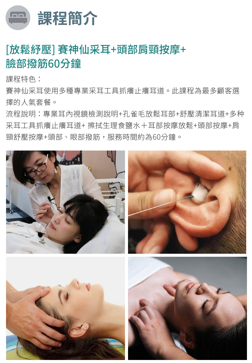 淡水【愛玲采耳】[放鬆紓壓] 賽神仙采耳+頭部肩頸按摩+臉部撥筋60分鐘(25mo)