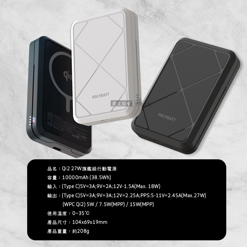 POLYBATT Qi2認證 27W旗艦級10000mAh快充行動電源 石墨烯散熱 磁吸無線充電 - 白色