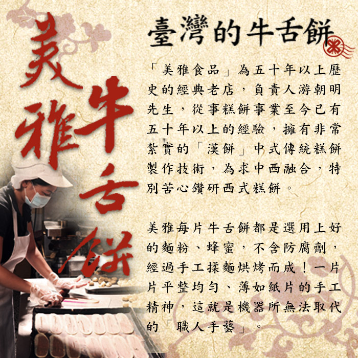 傳承最道地的傳統口味與專業的職人精神,每片手工牛舌餅,都是累積五十年的經典傑作。