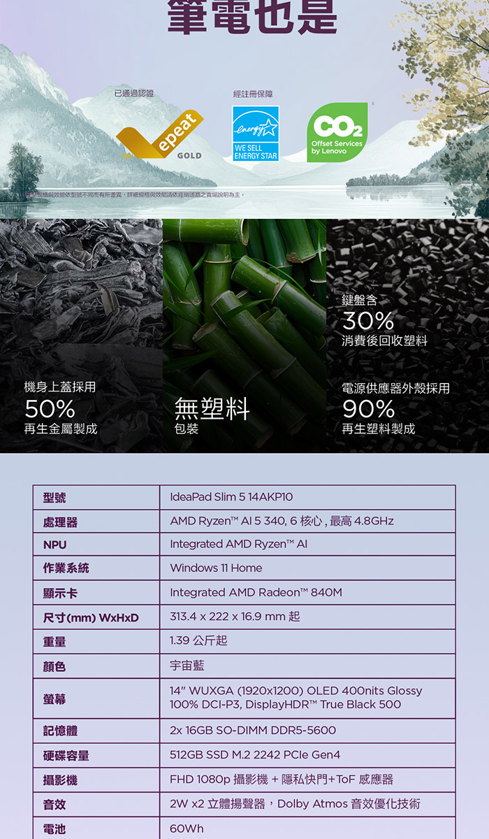 《Lenovo 聯想》IdeaPad Slim 5 83HX0047TW(14吋WUXGA/R AI 5 340/32G/512G+1TB SSD/特仕版)