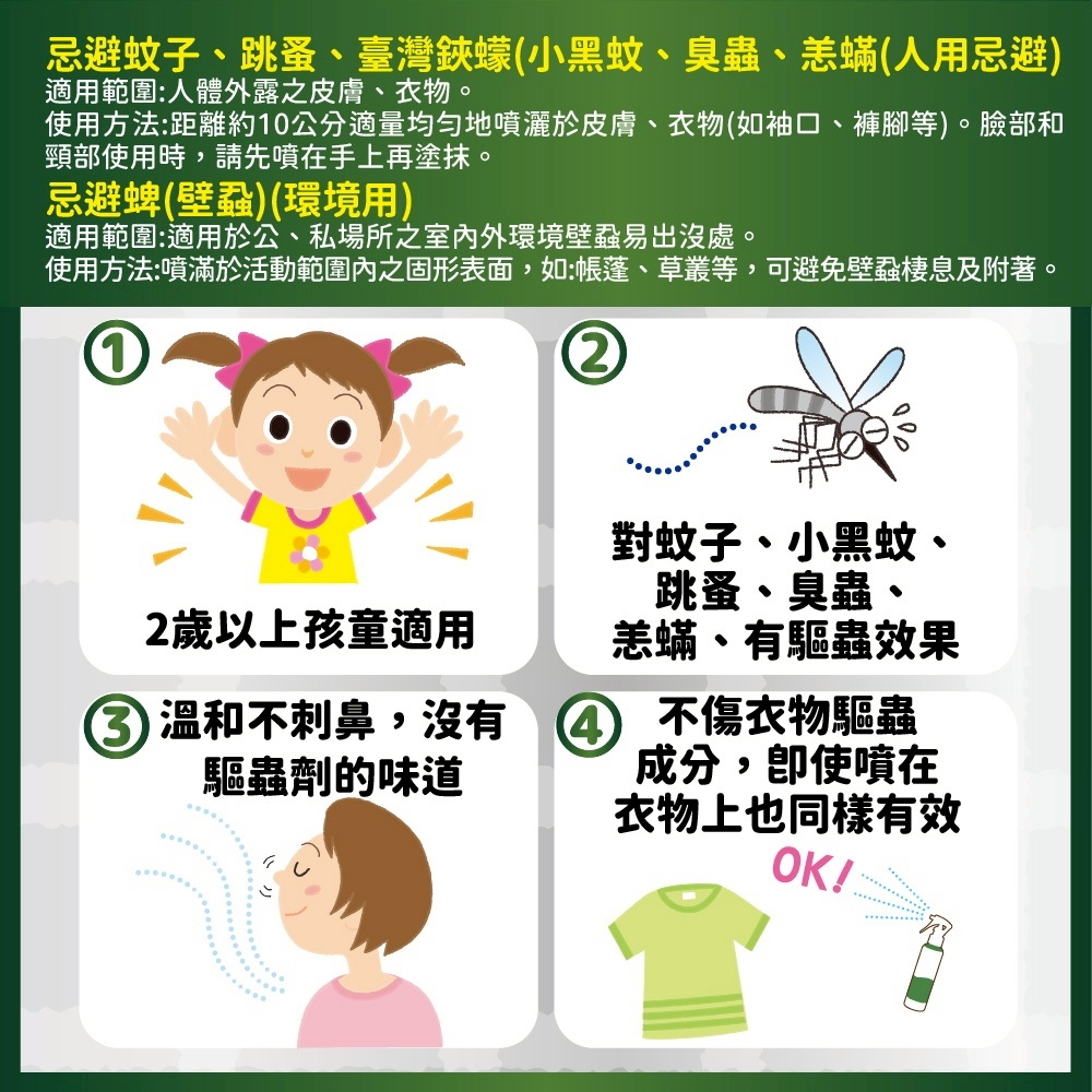 1.【忌避蚊子、跳蚤、臺灣鋏蠓(⼩⿊蚊、臭蟲、恙蟎(人用忌避)】 適用範圍:人體外露之皮膚、衣物。 使用方法:距離約10公分適量均匀地噴灑於皮膚、衣物(如袖口、褲腳等)。臉部和頸部使用時,請先噴在手上再塗抹。